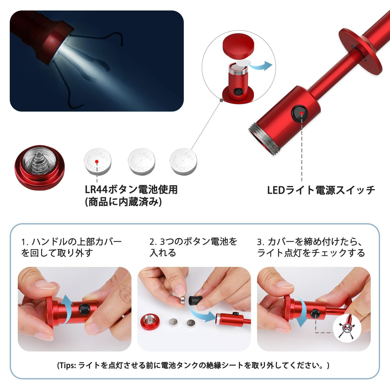 LEDライト内臓で暗い場所に落ちたネジ、ボルトを取り上げるのに便利です。