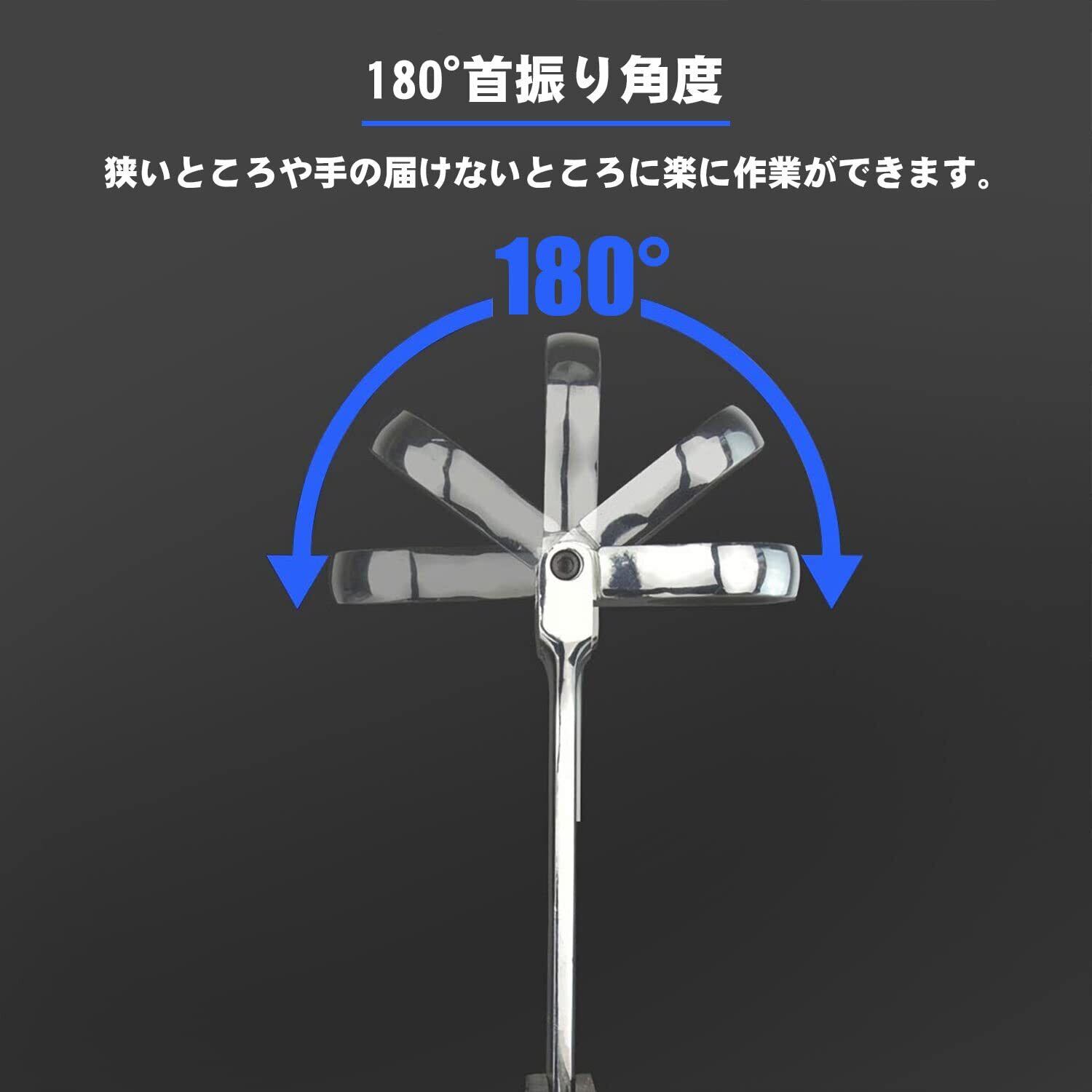 180度フレックスヘッド:180°角度調整できるフレックスヘッドは、ほとんどのラチェットレンチが届かない厄介な場所に作業することができます。72ギア仕様があり、フレックスヘッドを採用して、送り角度5°を実現し、自由なオフセット角での作業が可能です