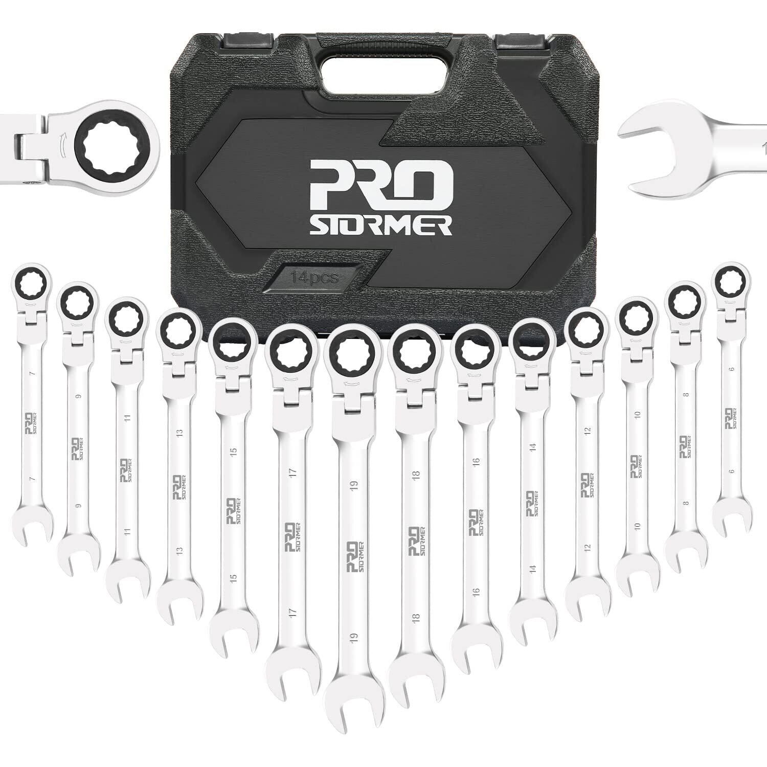 Prostormer フレックスラチェットレンチ 角度調整可能 72ギア ラチェットコンビネーションレンチセット 6-19mm 14本組 自動車修理 車メンテナンス 組み立て DIY 収納ケース付き