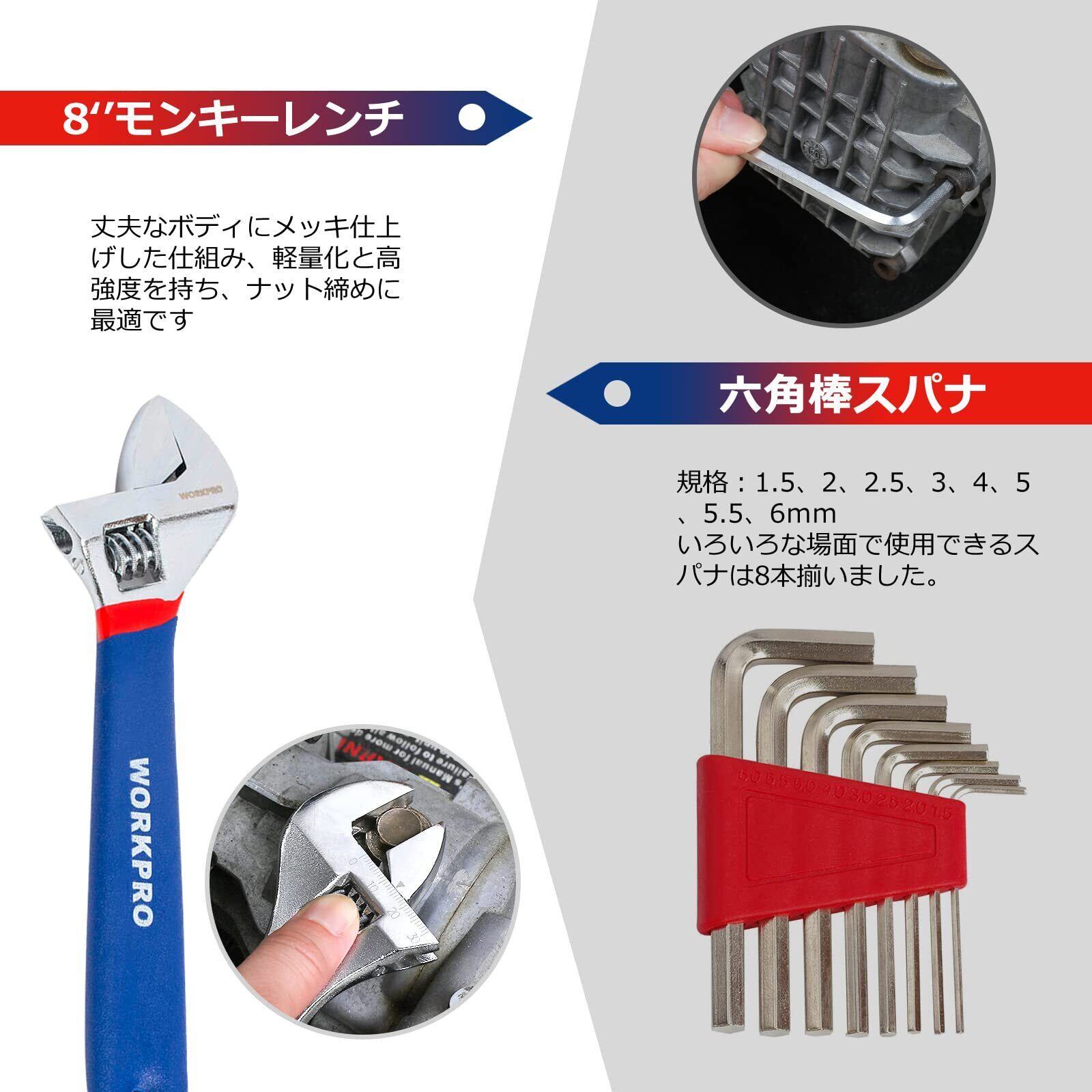 【セット内容】ラシオペンチ、精密ドライバー(2.5mm, 3.0mm, PH0, PH00)、 カッター、替え刃、差込角6.35mm(1/4インチ)の多機能ドライバーハンドル、差込角6.35mm (1/4インチ)のソケットセット(5、6、7、8、9、10、11、12、13mm)、ビットセット、ニッパープライヤー、爪ハンマー、内六角レンチ(1.5、2、2.5、3、4、5、5.5、6mm)、レベル、ビットセット、モンキーレンチ、プラスチックバンド。日曜大工に必要なものは一通り集まってきました。