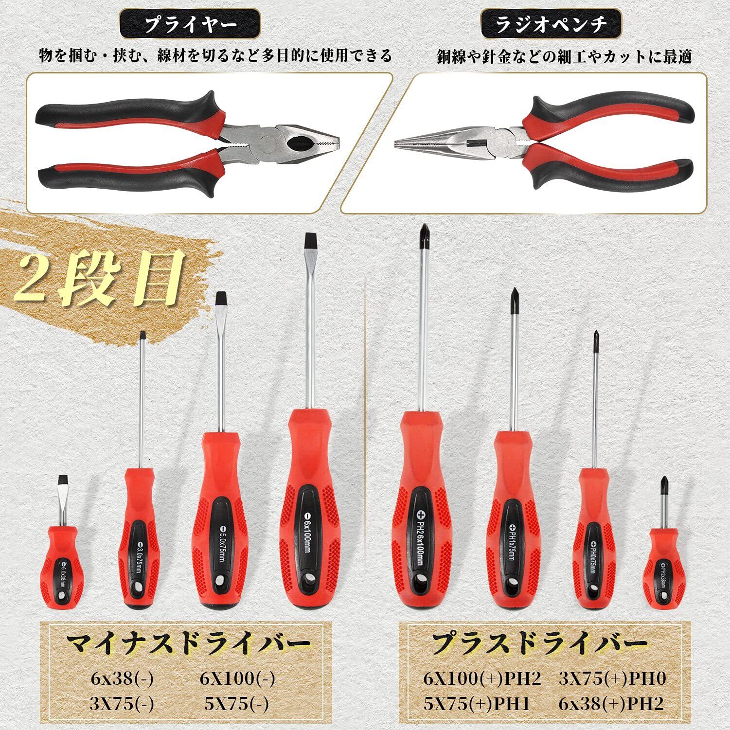 【多機能】家具の組み立てからDIY、整備までマルチに使える万能工具セットです。日常メンテナンスに必要な工具を詰め込んでいます。ドライバーやレンチなどをはじめとして、よく使われる工具でのセットとなっています。車や設備の保守、点検、そのほかの作業用工具、簡単な補修や緊急時の備えとしてツールをお勧めます。