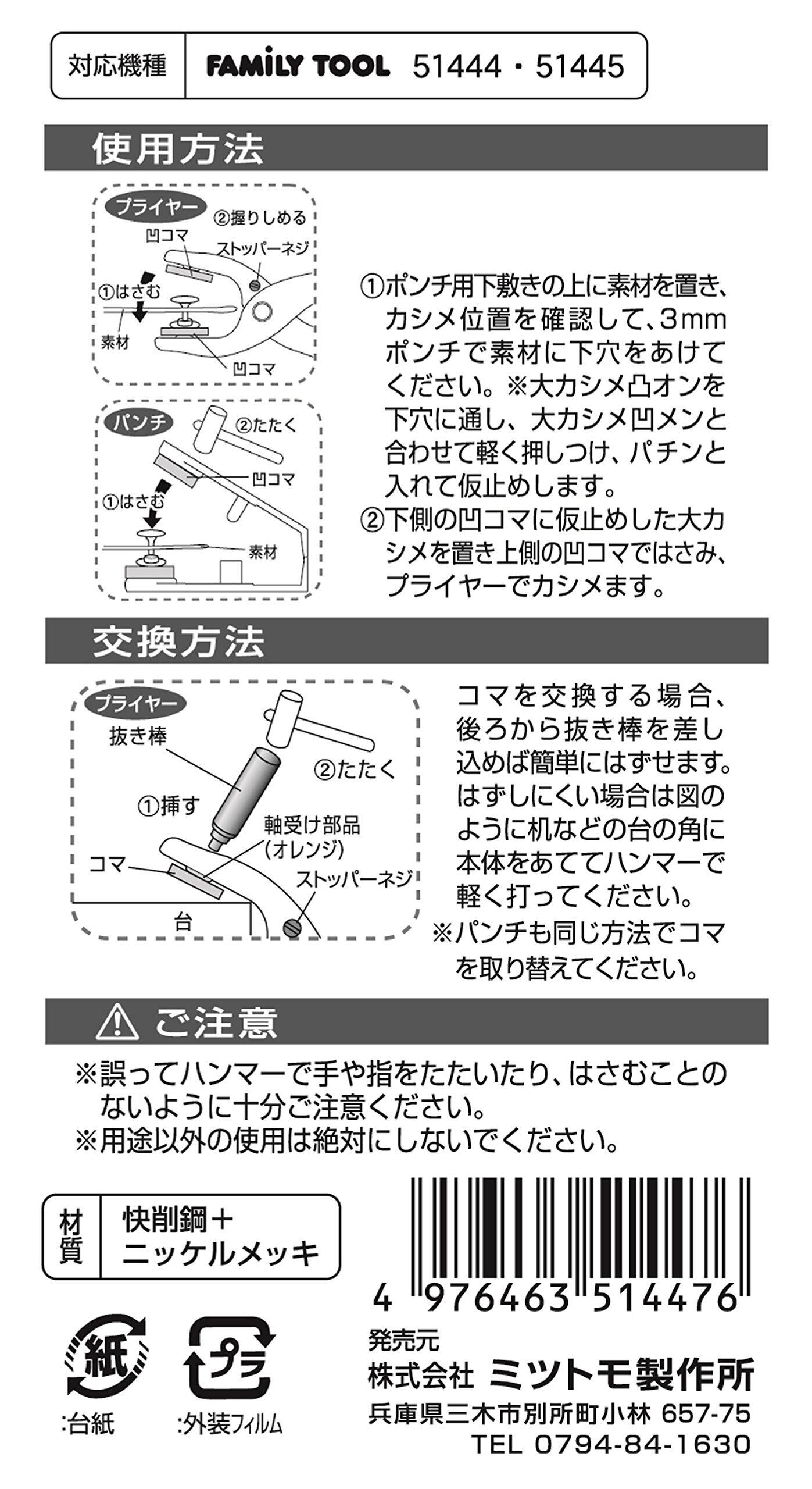 イチネンアクセス FAMILY TOOL(ファミリーツール) ハトメ 大カシメ用 コマ 51447 頭径:9mm 抜き棒付