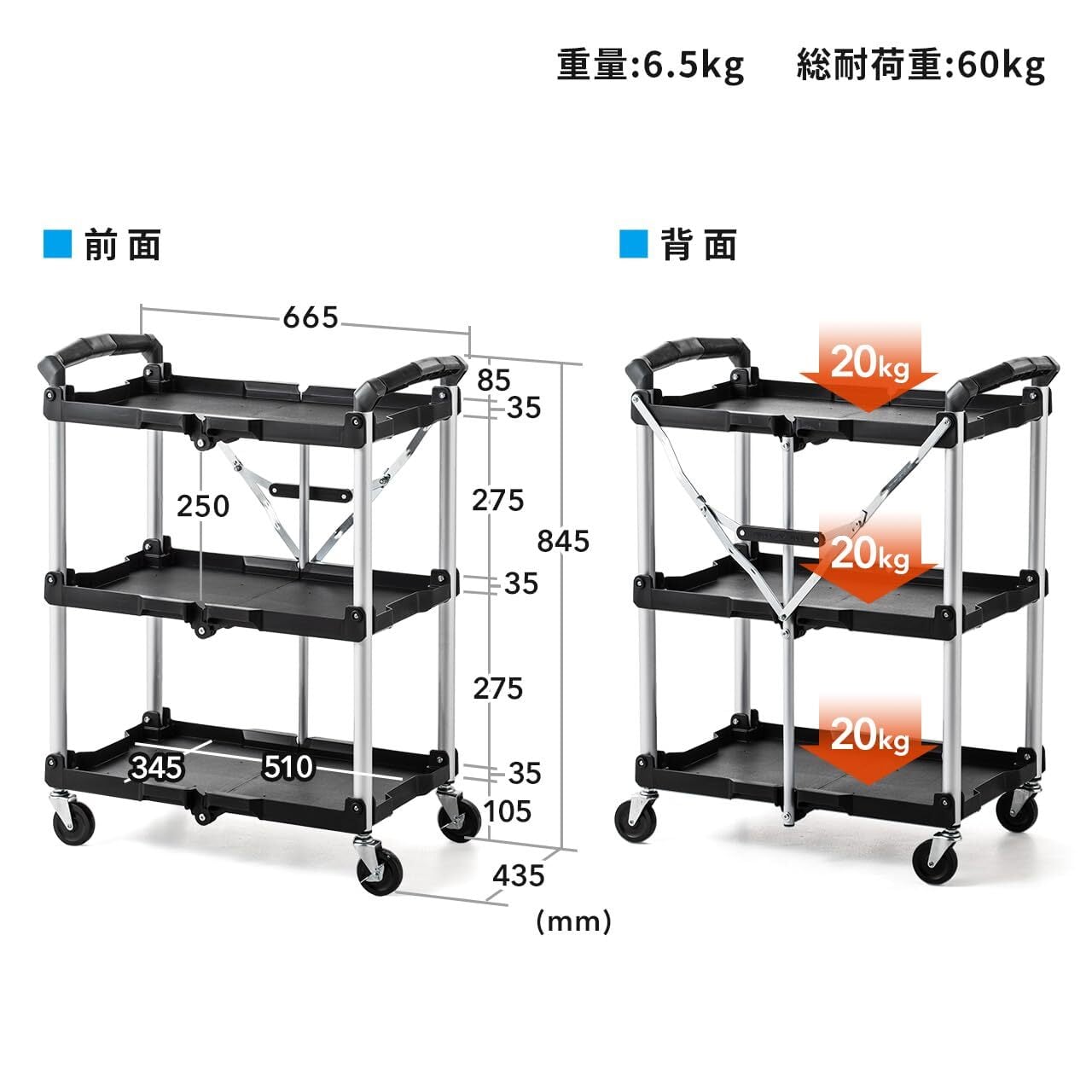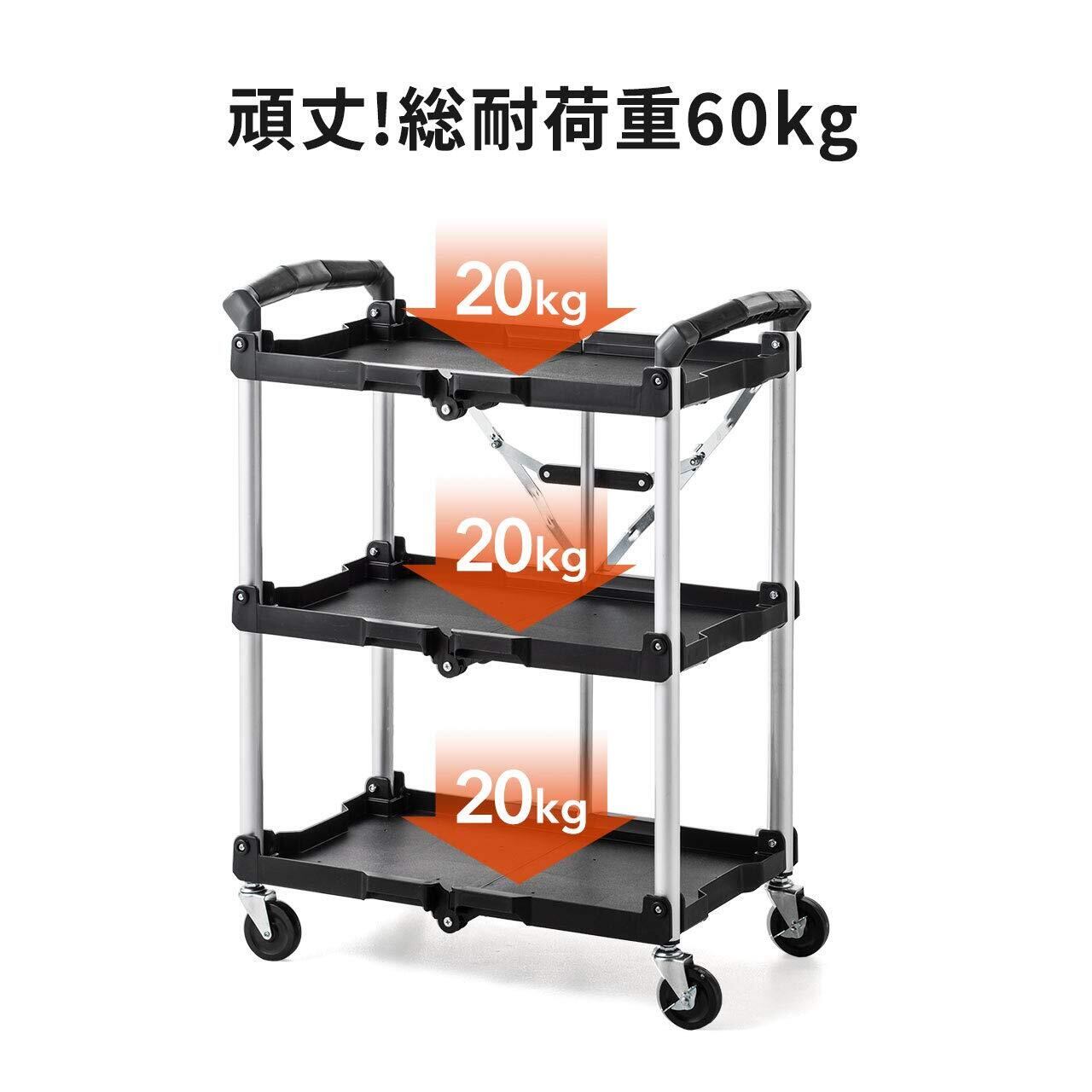 サンワダイレクト ツールワゴン キャスター付き 3段 折りたたみ 総耐荷重60kg 軽量 100-CART008