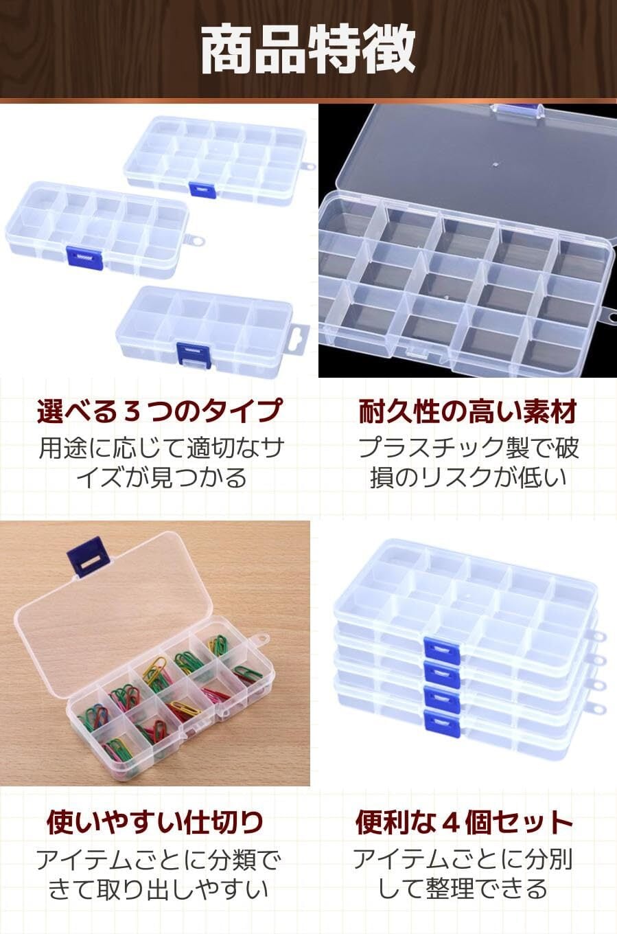 【商品特徴】①選べる3つのタイプ:用途に応じて適切なサイズが見つかる/②耐久性の高い素材:プラスチック製で破損のリスクが低い/③使いやすい仕切り:アイテムごとに分類できて取り出しやすい/④便利な4個セット:アイテムごとに分別して整理できる