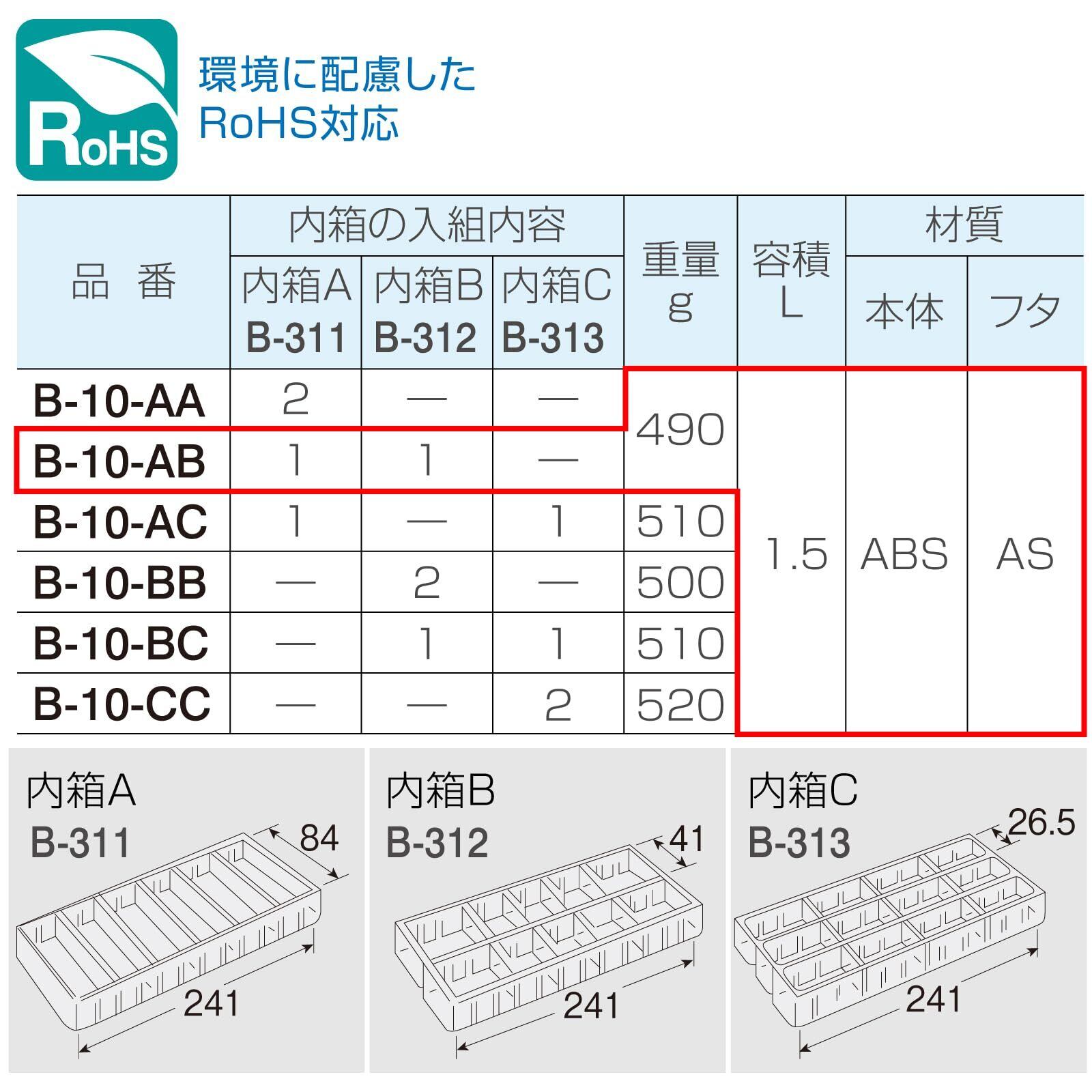 外箱の中に内箱を組み込むことが可能な二重構造。B-10-ABは内箱A(1列・最大仕切小間数:12)と内箱B(2列・最大仕切小間数:24)が各1個付属します。