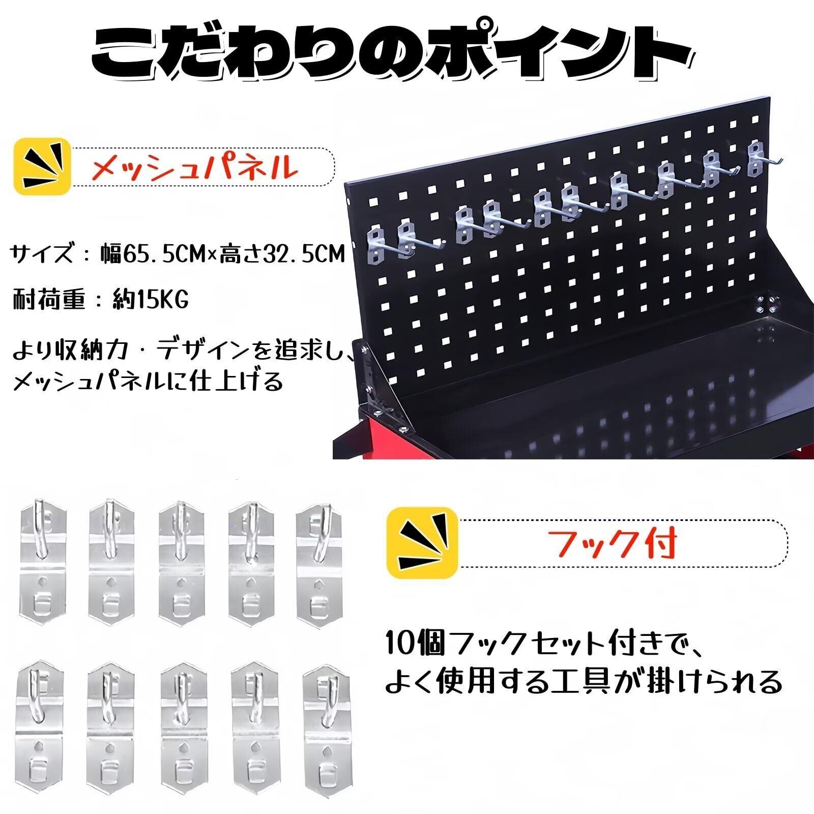 ✦【メッシュパネル・フックセット】より便利性・収納力・デザインを追求し、メッシュパネルに仕上げました。10個フックセット付きで、よく使用する工具が掛けられます。