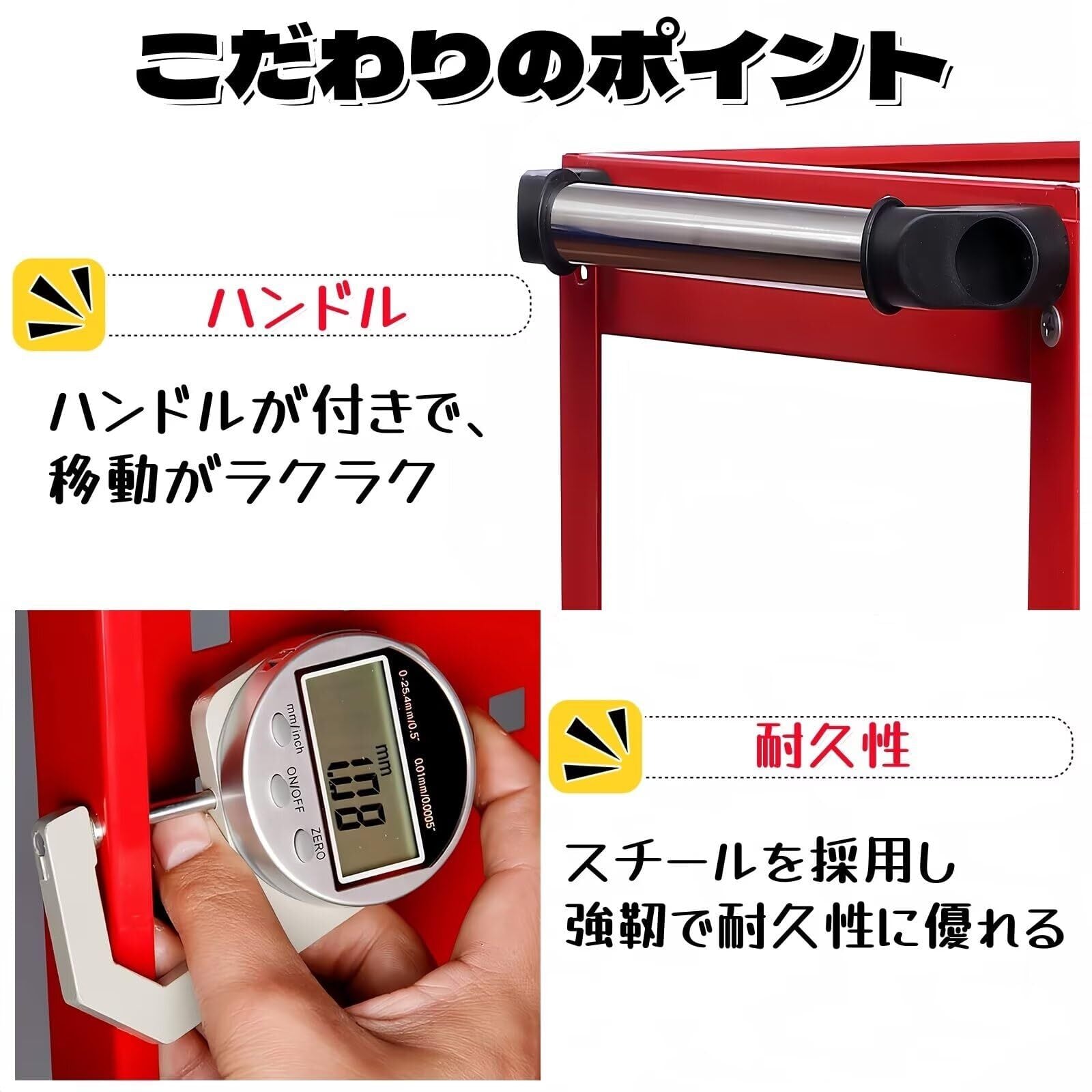 ✦【耐久性・機能性】トレイ深さは、約5.8cmあるので工具が転げ落ちる事なく色々乗せることができます。ガレージ作業や工具の運搬に、ちょっとした作業台としてもお使いいただけます。背が高いので立ち作業にもぴったりです。強靭で耐久性に優れ、高品質のスチールを採用しています。高温焼付塗装加工され、色落ちにくく、長持ち可能です。