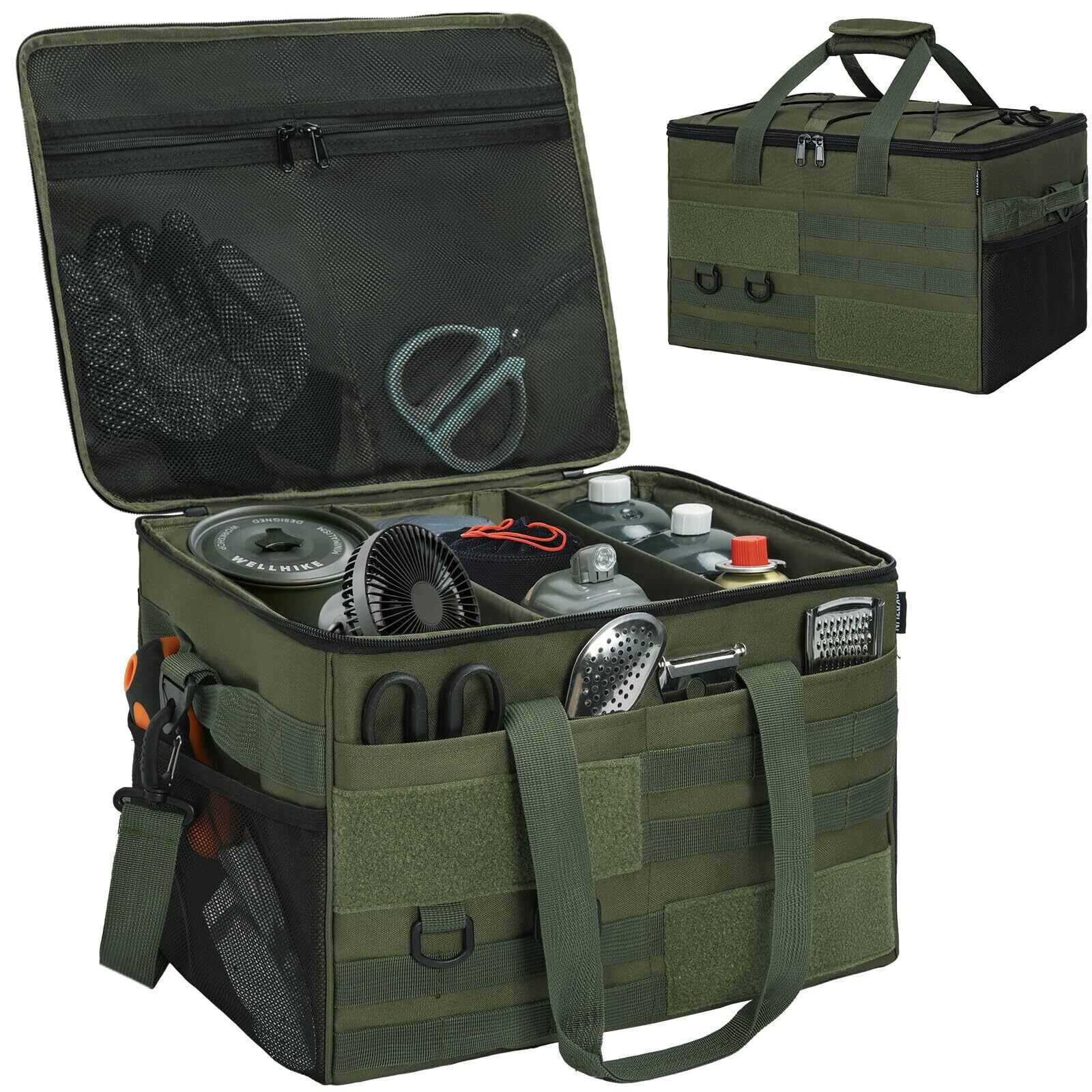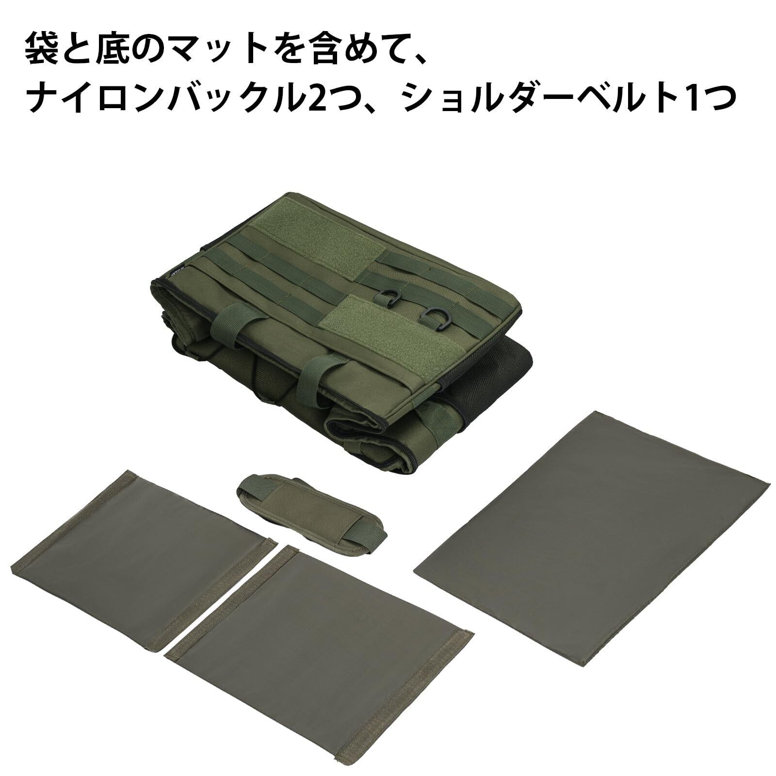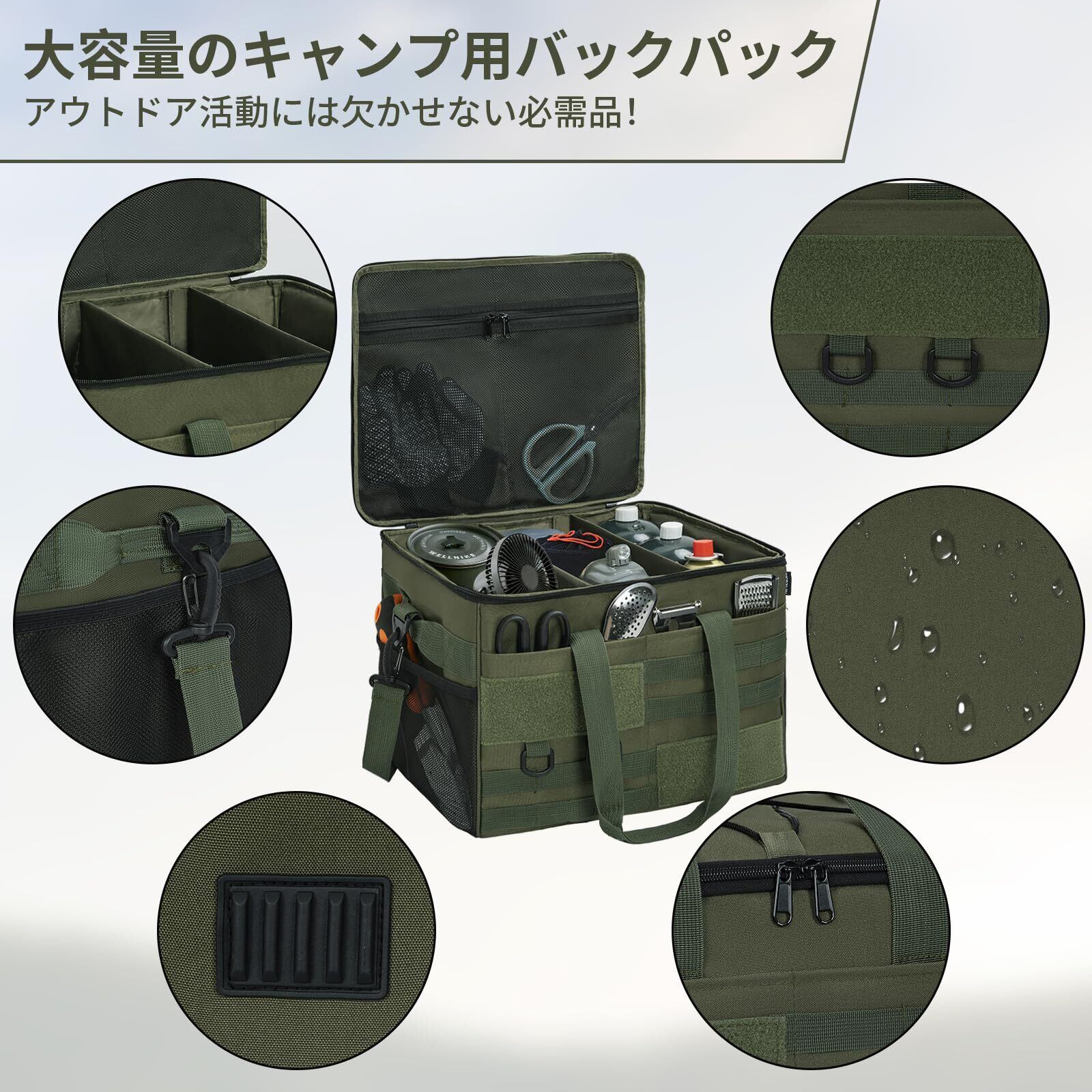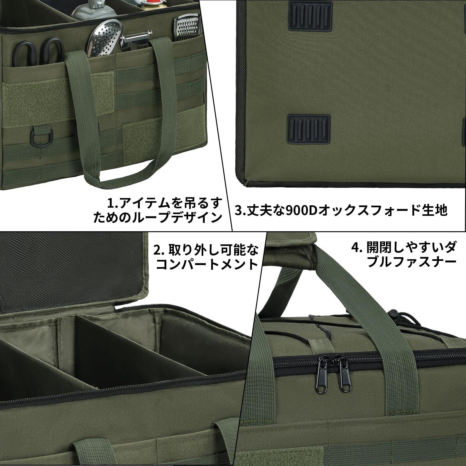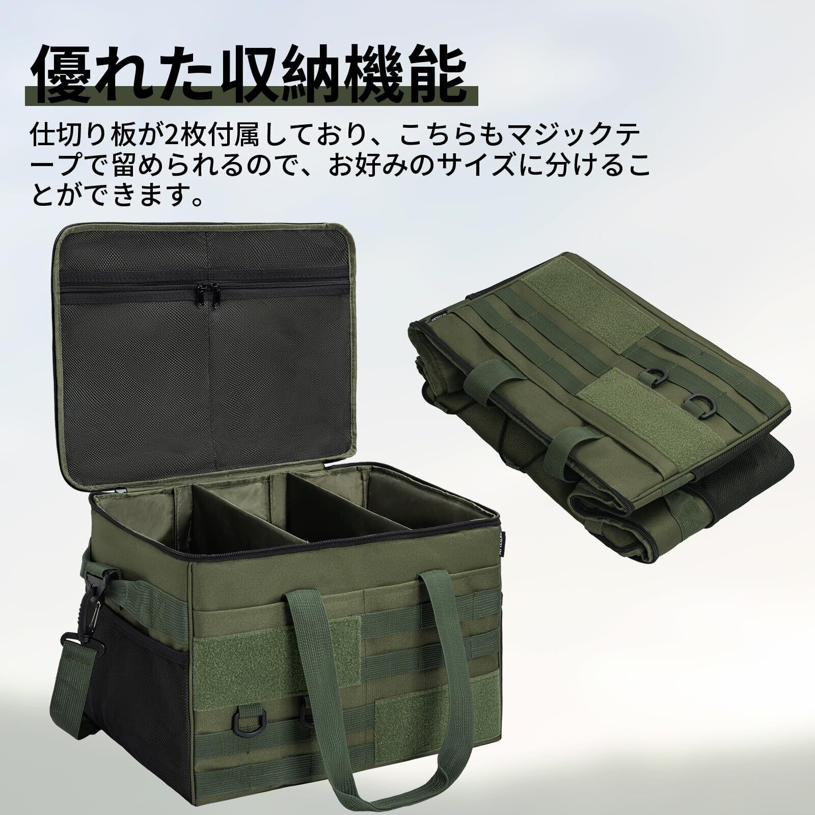 多機能パーティションデザイン:2つのパーティションが装備されており、ベルクロで固定されており、ニーズに応じて収納スペースのサイズとレイアウトを柔軟に調整できます。斧、釘、キャンプファイヤーラック、薪ストーブ、ケトル、屋外用ストーブ、その他のキャンプ必需品の保管に最適なように設計されています。トートバッグやゴミ箱としても使えて多用途に使えます。
