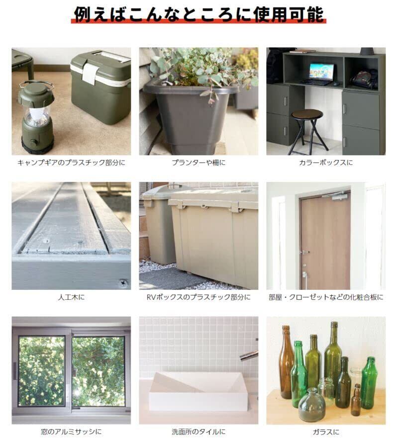 【用途】プラスチック(PE、PP、ABS樹脂、PET)、FRP、ガラス、アクリル板、亜鉛メッキ・アルミ・ステンレス・ガルバリウム・クロームメッキ・人工木など塗料の密着の悪い金属、鉄、銅、スチール、鉛・進駐、カラートタン、押出成形セメント板、サイディングボード、モルタル、ブロック、PC板、けい酸カルシウム板、ALC、住宅用化粧スレート屋根、GRC、化粧板、硬質塩ビ、木部、コンクリート・モルタルなどの幅広い素材。 ※素材の状況などによっては密着しない場合がありますので、必ず見えにくいところなどで試し塗りをしてください。