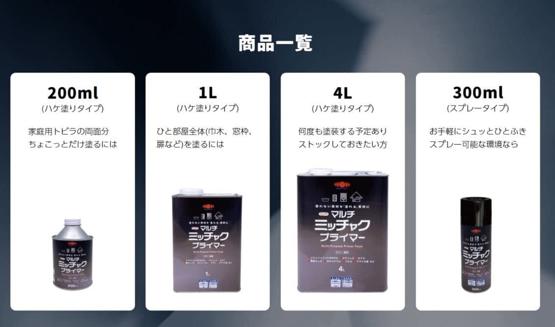 【特長】 幅広い用途に使用できる油性(弱溶剤)1液型プライマーです。 上塗りの適正は(ラッカー・油性・水性)です。 プラスチックなどの樹脂面から亜鉛メッキなどの金属面まで幅広い素材に対応します。 トルエンフリー・弱溶剤タイプでクロムなどの有害金属を使用していない環境配慮商品です。