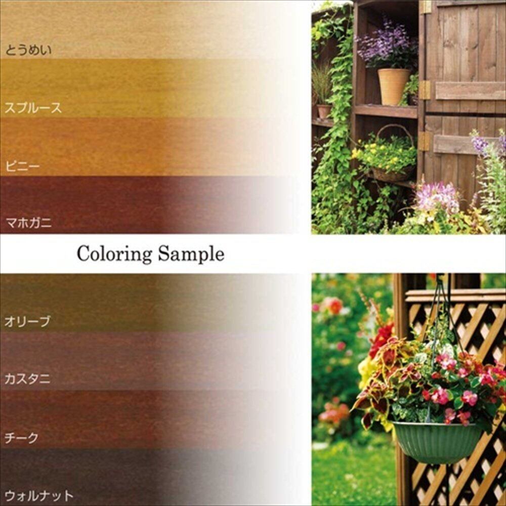 【特長】■[木材をガード! ]優れた木材防腐、防かび、防虫、防藻効果を発揮します。■[色褪せも防止! (UVカット効果)]日焼け(紫外線)による木材の色あせを防止します。■[木目を生かした仕上げ]木材に浸透し、木目を生かした半透明着色仕上げになります。■[木材に浸み込み易い]油性木部保護塗料と比べ、臭いが少なく、取り扱いが簡単な水性タイプ。塗装が初めての方や女性にもオススメ。 【用途】※表記以外の用途には使用しないでください。※屋外の木部専用塗料です。■[ガーデニング / 木製品]ウッドデッキ / ログハウス / パーゴラ / ラティス / プランターなどウッドクラフト / 工作品など。羽目板、窓枠、破風、戸袋、板べいなど 【塗れないもの】■[吸い込まない素材]ワックスが塗られている素材 / 塗料が塗られている素材 / 吸い込みのない化粧合板 など■[常に水がかかる所]常に水がかかる所には塗れません。■[食と関わる場所]食品と接触する所 / 食器が置かれる所■[室内・密閉性がある場所]木製の鳥籠 / 犬小屋 / 温室の内部の木材 / 脱衣所の木材■[火気のある場所]火気のあるところでは塗らないで下さい。■[動植物などにご注意]塗料が庭木・草花など植物にかからないようにして下さい。また、金魚や魚類がいる池などに塗料が入らないように注意して下さい。 【塗装時の注意】※取扱いの際は、商品記載の注意事項等をよく読んでからご使用ください。■[スプレーは使わないで]スプレー塗装(吹きつけ作業)は行なわないで下さい。■[仕上りは下地の色によって左右される]下地の色や吸い込みの度合いによって仕上がり感や色、乾燥性が左右されますので、目立たない ところで試し塗りし、色・浸透性・下地への影響等を確認してください。■[条件によって異なります]塗り面積・乾燥時間・着色力・色合いなどは、素材や塗り方、気象条件などで多少異なります。■[次のような症状をお持ちの方は作業しないでください]体調の悪い人 / 薬品・化学品アレルギーの人 / じんましん・かぶれ・気管支喘息をおこしやすい人 / 妊娠している人など。■[色味は多少異なります]容器の色表示は印刷のため、中身の色と多少異なることがあります。 【用具の洗浄】水(薄めずそのままご使用ください) 【乾燥・塗重時間】 【20℃】乾燥時間:約 1 時間/塗重時間約 2 時間 【冬期】 乾燥時間:約 2 時間/塗重時間:約 2 時間