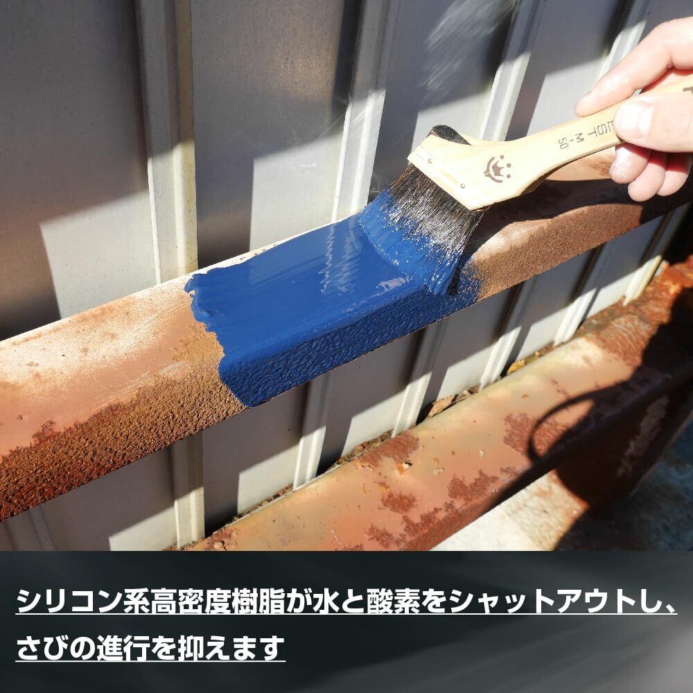 さびを落とさず、さびの上から直接塗ることができます。 シリコン系高密度樹脂が水と酸素をシャットアウトし、さびの進行を抑えます。 高耐久シリコン樹脂なので、塩害・酸性雨・排気ガス・紫外線から、素材をしっかりガードします。また、アルミにも塗ることができます。 1回塗りで乾きが速く、作業性が抜群です。