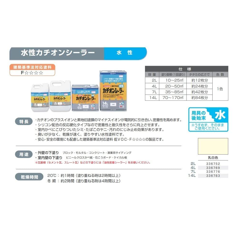 【特徴】 ■[密着性UP! ]カチオンのプラスイオンと素地、旧塗膜のマイナスイオンが電気的に引き合い、密着性を高めます。 ■[密着性 & 耐久性がUP! ]シリコン配合の反応硬化タイプなので密着性と耐久性をさらに向上させます。 ■[扱いやすいペンキ]水性なので臭気も弱く、取り扱いも簡単です。【用途】 ■[建材の下塗り]ブロック / モルタル / コンクリート / サイディング(セラミック系は除く)など ■[各種下塗り]室内のビニールかべ紙 / 石こうボード / ケイカル板 ■[密着向上に]外壁塗り替え塗装時 / 旧塗膜 【塗れないもの】■表示以外の用途には使用しないこと。 ■ツルツルした表面・特殊加工された物 シリコン樹脂・フッ素樹脂・タイル・陶器・天然石、特殊防水加工された素材などには使用できません。 ■常に水がかかる所 プール / 浴槽 / 浴室の床 / 池【乾燥・塗重時間】 【20℃】乾燥時間:約 1 時間 塗重時間:約 2 時間以上 【冬期】乾燥時間:約 2 時間 塗重時間:約 4 時間以上 【塗り面積(1回塗り)】 2L:平方メートル:約 10 ~ 25 m² タタミの広さ:約 12 枚分 4L:平方メートル:約 20 ~ 50 m² タタミの広さ:約 24 枚分 7L:平方メートル:約 35 ~ 85 m² タタミの広さ:約 42 枚分 14L:平方メートル:約 70 ~ 170 m² タタミの広さ:約 84 枚分【注意事項】 ■セメント瓦、スレート瓦などには当社の「油性シーラー」をお使いください。 ■使用する時はローラートレイ(金属容器は錆びるので不可)に小出ししてお使いください。 ■本品はうすめずにお使いください。 ■混ぜないで 他の塗料とは絶対に混ぜないでください。 また他の塗料と、ハケ・ローラーなどの用具を共用すると固まりますのでおやめください。 ■乾くと色が変わります。 乳白色の液体ですが、乾くとほぼ透明になります。 ■乾くまで水気厳禁 浴室・トイレ・洗面所は塗装後1日以上水・湯気がかからないようにしてください。 ■乾燥時間について 乾燥時間、塗り面積の表示は、気象条件・塗る素材・形状・塗り方によって多少異なります。【用具の洗浄】 水 (薄めず、そのままご使用ください。)
