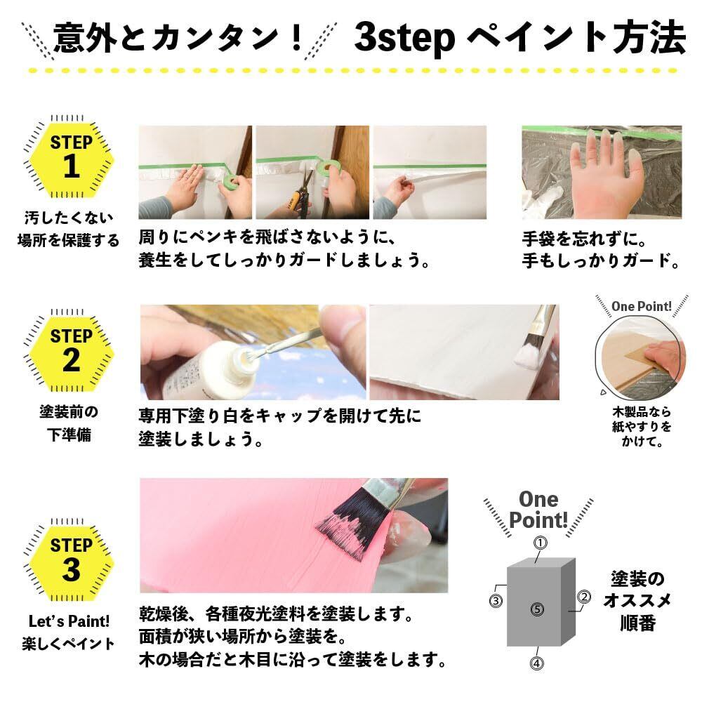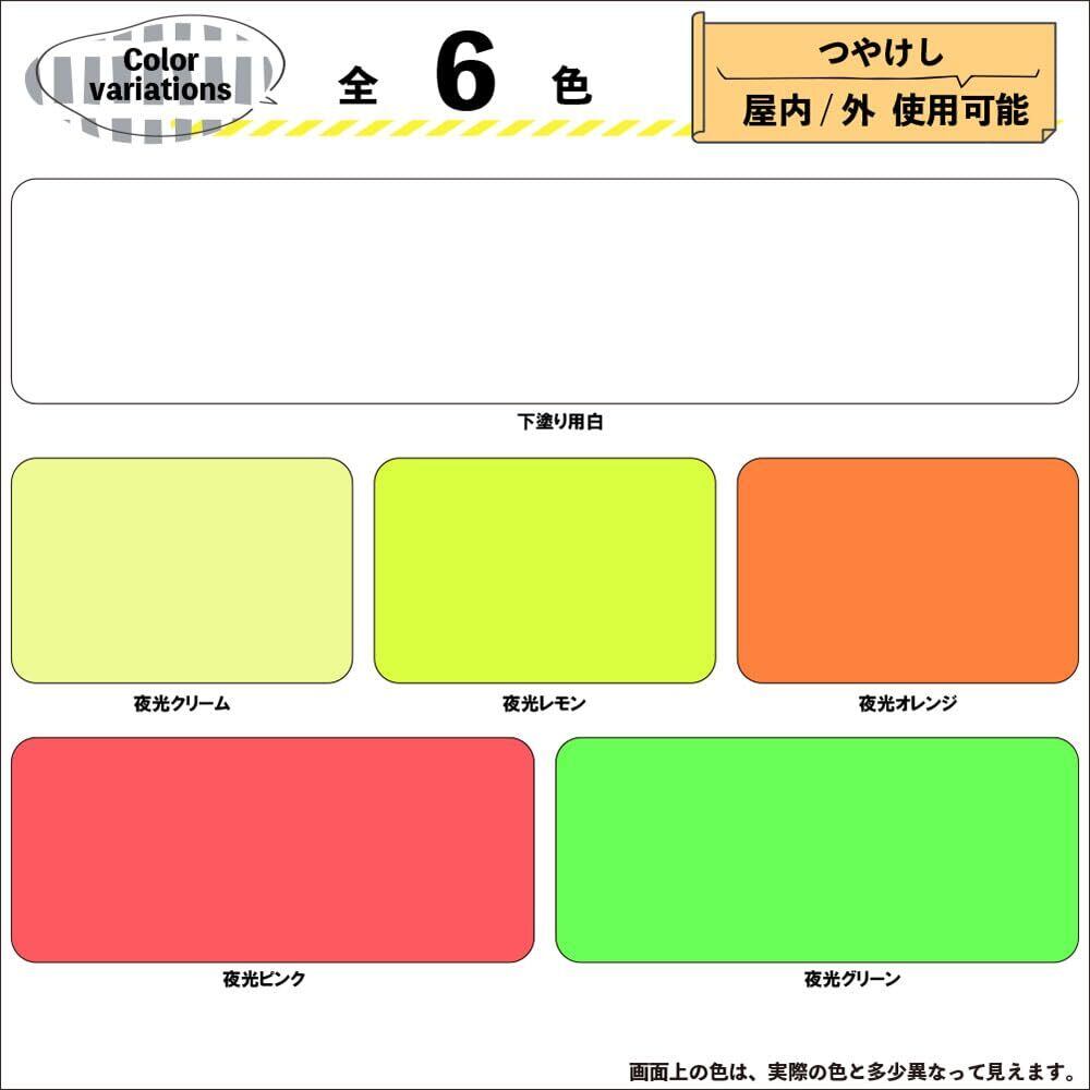 【特長】 ■[絵具の様に使えるペンキ]簡単・便利・コンパクトな水性工作用塗料。使いたい量だけ出して使用する事が出来ます。■[2種類の形]絵具のように使えるチューブタイプと、ササッと塗れるマニキュアタイプの2種類ございます。■[使いやすいペンキ]臭いが少なく、乾燥が速く、塗り易い水性塗料です。■[チューブの30mlにはアタッチメントも]30mlタイプに使用可能な専用アタッチメントがあります。■[目立ちます]昼間は鮮明な蛍光色、夜は暗闇でソフトな光を発します。■[光をあてる時間]光を3~5分程度当てると暗闇で15分程度発光します■[当てる光の種類]照射する光は、蛍光灯・水銀灯・紫外線ランプ(ブラックライト)などの波長の短い光が有効です。■[下塗りを塗ると]蛍光塗料・夜光塗料の下塗りを使用することで、より鮮明に発色します。 【用途】■[ホビー・工作・補修]木製品 / 鉄製品 / プラスチック / コンクリート / モルタル など 【塗れないもの】■[室内外 各場所]自動車 / バイク / 高級家具 / 床面 / ビニールクロス 等■[食に関する物]食器・玩具など口に触れる危険性のある物■[鉄以外の金属]ステンレス / アルミ / メッキ / 真ちゅう / 銅 / ホーロー■[一部のプラスチック]ポリエチレン / ポリプロピレン等■[ツルツルした所]タイル / 化粧板 / 陶器 等■[吸い込みの激しい物]素焼きのタイル・鉢 等/ MDF材 等■[特殊処理された素材]フッ素 / シリコン 等 【乾燥・塗重時間】 【20℃】乾燥時間:約 1 時間/塗重時間約 2 時間 【冬期】 乾燥時間:約 2.5 時間/塗重時間:約 4 時間 【うすめ液・用具の洗浄】水(塗りにくくなった時だけ5%以内で薄めます)