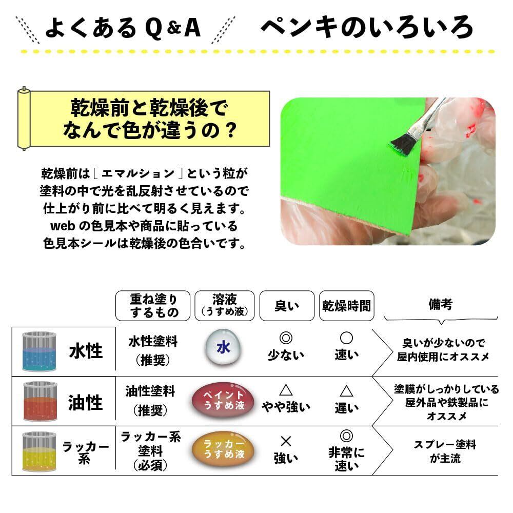 【塗れないもの】■[室内外 各場所]自動車 / バイク / 高級家具 / 床面 / ビニールクロス 等■[食に関する物]食器・玩具など口に触れる危険性のある物■[鉄以外の金属]ステンレス / アルミ / メッキ / 真ちゅう / 銅 / ホーロー■[一部のプラスチック]ポリエチレン / ポリプロピレン等■[ツルツルした所]タイル / 化粧板 / 陶器 等■[吸い込みの激しい物]素焼きのタイル・鉢 等/ MDF材 等■[特殊処理された素材]フッ素 / シリコン 等