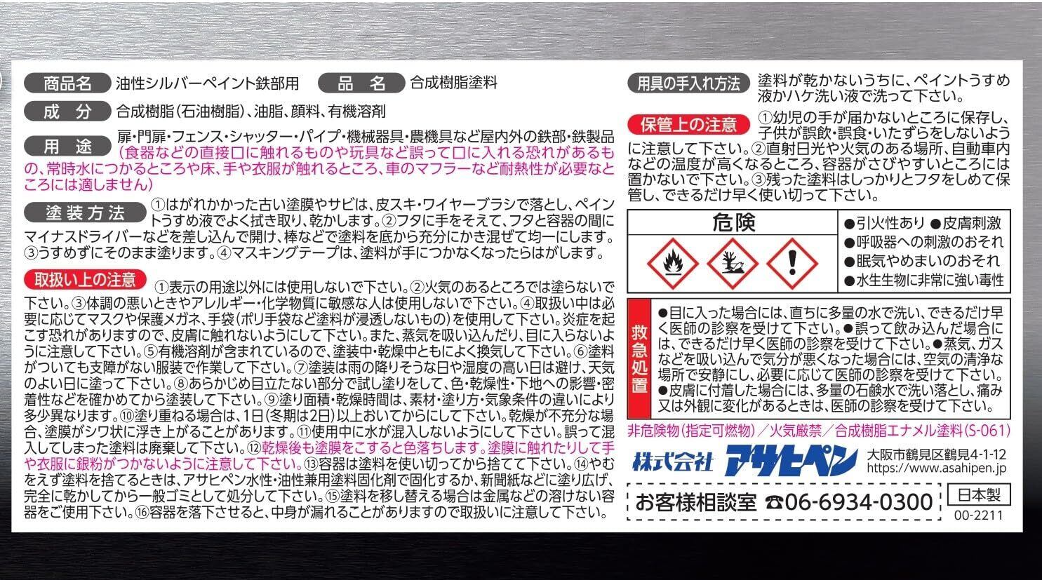 注意事項:●表示の用途以外には使用しないで下さい。 ●火気のあるところでは塗らないで下さい。 ●体調の悪いときやアレルギー・化学物質に敏感な人は使用しないで下さい。 ●取扱い中は必要に応じてマスクや保護メガネ、手袋(ポリ手袋など塗料が浸透しないもの)を使用して下さい。炎症を起こす恐れがありますので、皮膚に触れないようにして下さい。また、蒸気を吸い込んだり、目に入らないように注意して下さい。 ●有機溶剤が含まれているので、塗装中・乾燥中ともによく換気して下さい。 ●塗料がついても支障がない服装で作業して下さい。 ●塗装は雨の降りそうな日や湿度の高い日は避け、天気のよい日に塗って下さい。 ●あらかじめ目立たない部分で試し塗りをして、色・乾燥性・下地への影響・密着性などを確かめてから塗装して下さい。 ●塗り面積・乾燥時間は、素材・塗り方・気象条件の違いにより多少異なります。 ●塗り重ねる場合は、夏期1日以上、冬期2日以上乾かしてから塗って下さい。乾燥が不充分な場合、塗膜がシワ状に浮き上がることがあります。 ●使用中に水が混入しないようにして下さい。誤って混入してしまった塗料は廃棄して下さい。 ●乾燥後も塗膜をこすると色落ちします。塗膜に触れたりして手や衣服に銀粉がつかないように注意して下さい。 ●容器は塗料を使い切ってから捨てて下さい。 ●やむをえず塗料を捨てるときは、アサヒペン水性・油性兼用塗料固化剤で固化するか、新聞紙などに塗り広げ、完全に乾かしてから一般ゴミとして処分して下さい。 ●塗料を移し替える場合は金属などの溶けない容器をご使用下さい。 ●容器を落下させると、中身が漏れることがありますので取扱いに注意して下さい。
