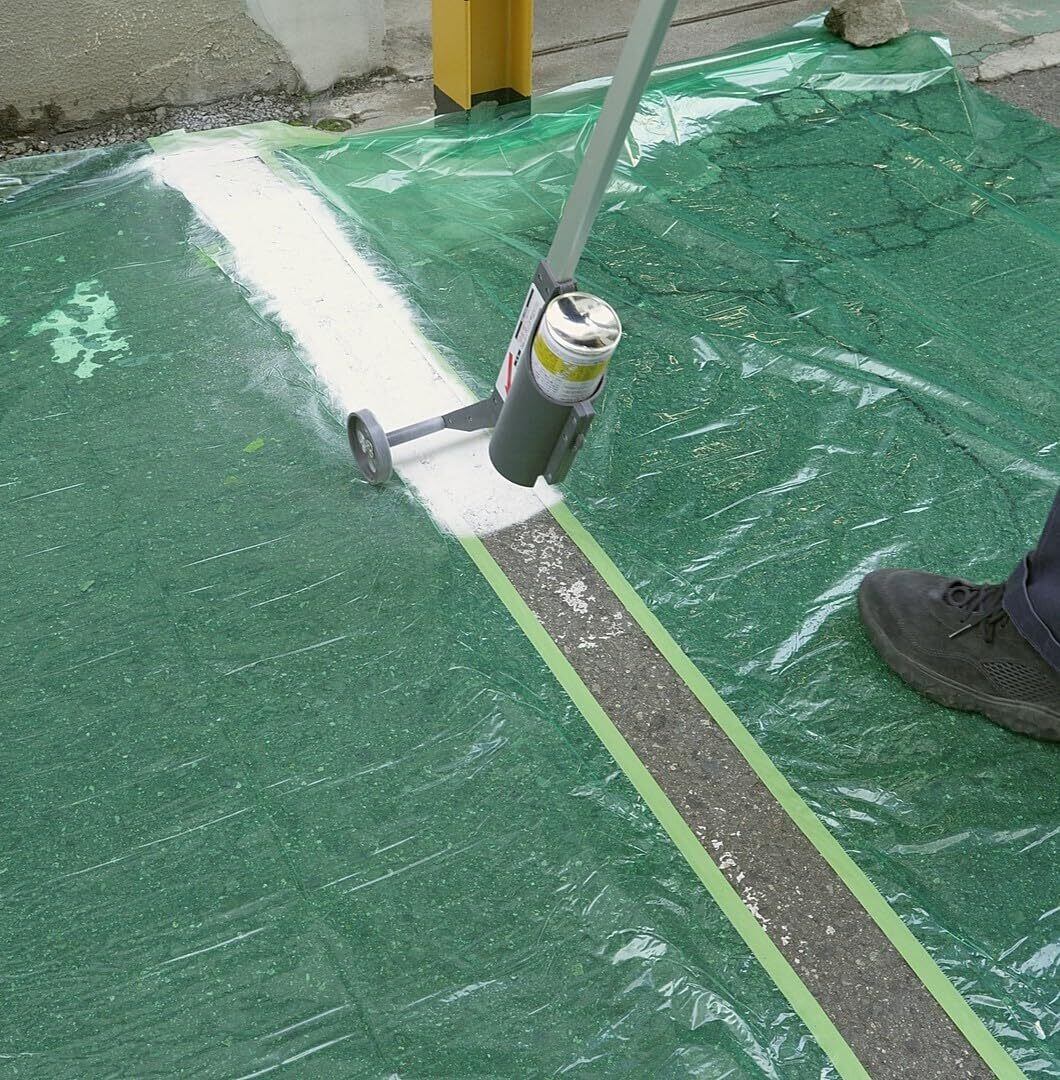 道路線引き用スプレーをセットするだけで簡単に区画線引きができます。