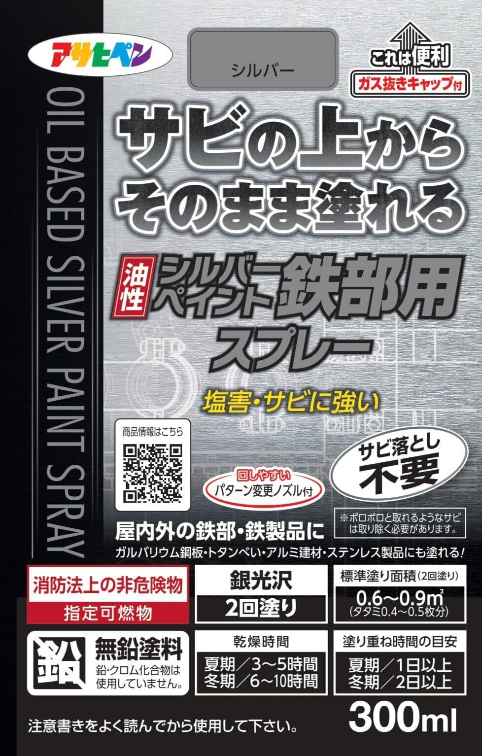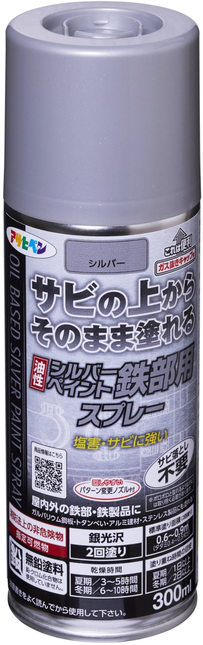 アサヒペン 塗料 ペンキ 油性シルバーペイント 鉄部用スプレー 300ml シルバー 油性 サビの上からそのまま塗れる ツヤあり 塩害・サビに強い 遮熱効果 アルミニウムペイント 非危険物(消防法上) 日本製
