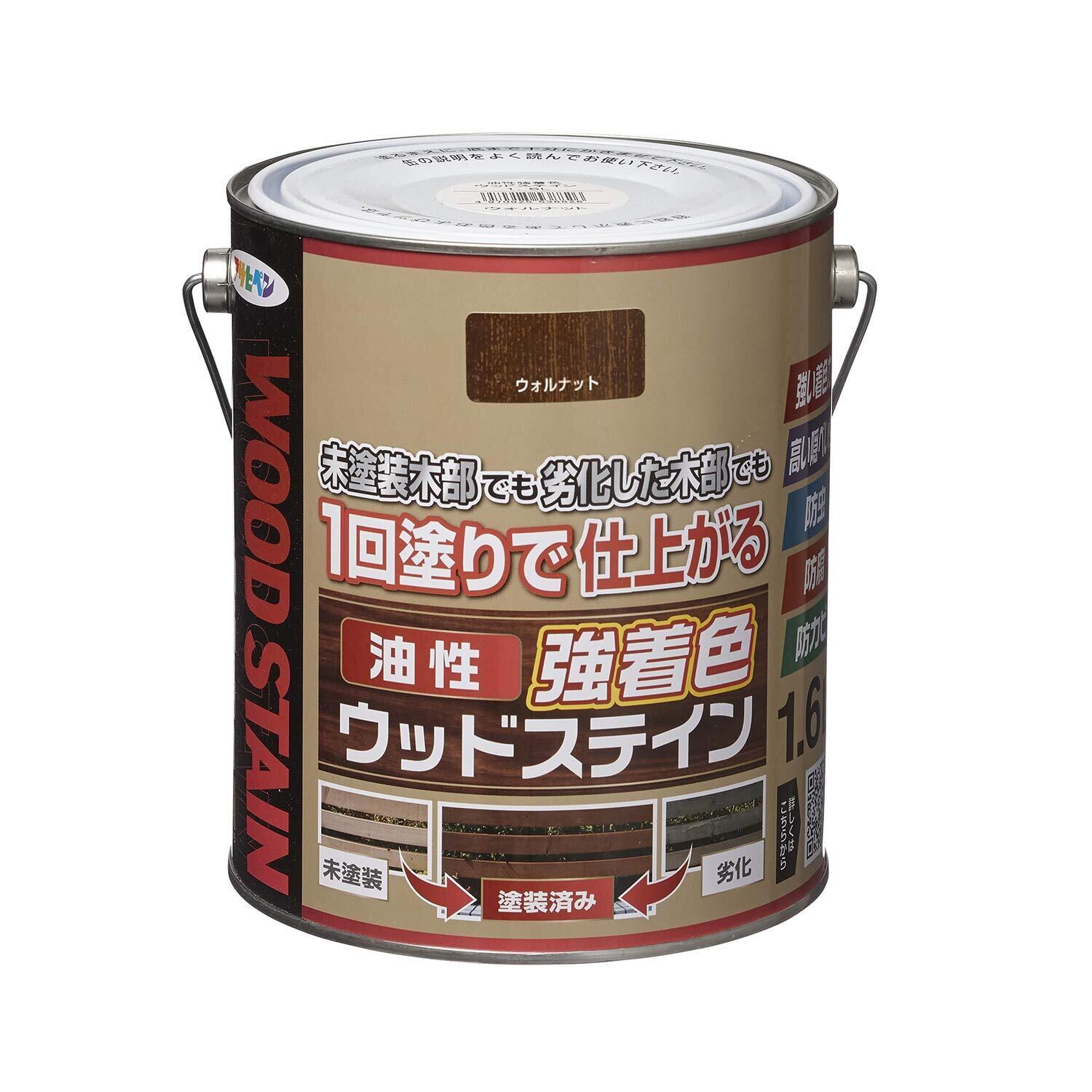 アサヒペン 塗料 ペンキ 油性強着色ウッドステイン 1.6L ウォルナット 油性 木部用 1回塗り 塗りやすい 日光や雨に強い 耐候性 はっ水 美しく保つ 木部保護 防カビ 防虫 防腐 高い隠ぺい性 時短 経済的 ステイン仕上げ 劣化した木部もきれいに仕上がる 塗り替え 日本製