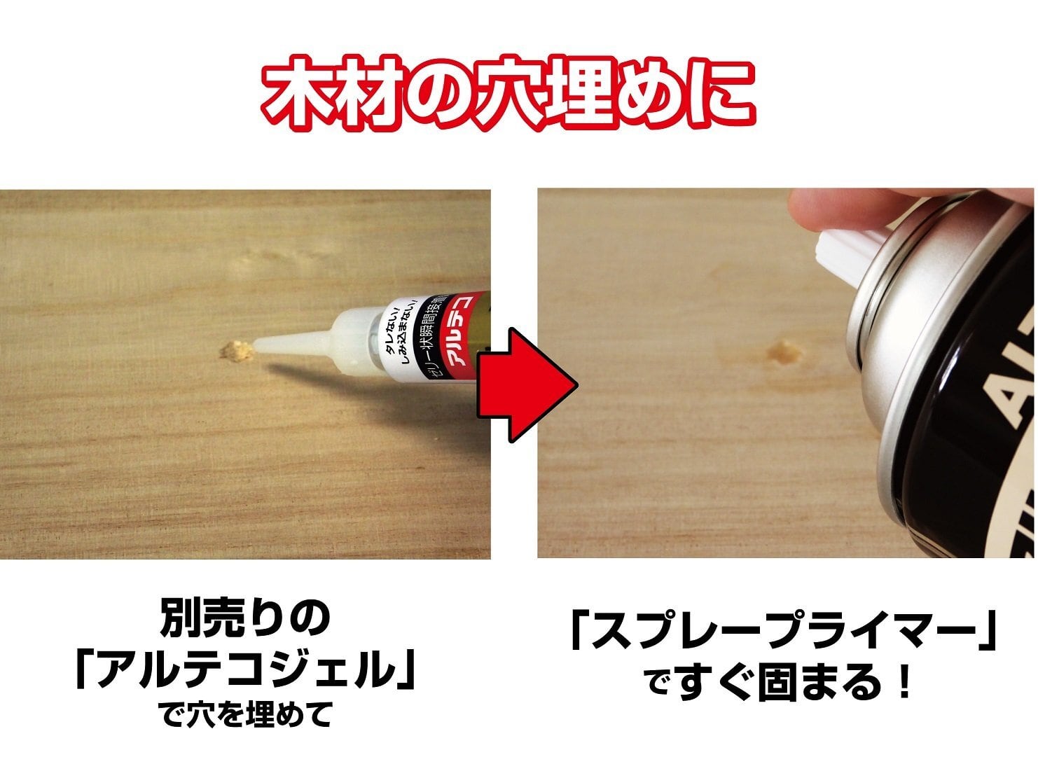 瞬間接着剤による穴うめ充てん接着、盛り上げ接着に、木材など瞬間接着剤がしみ込みやすい材質の接着に