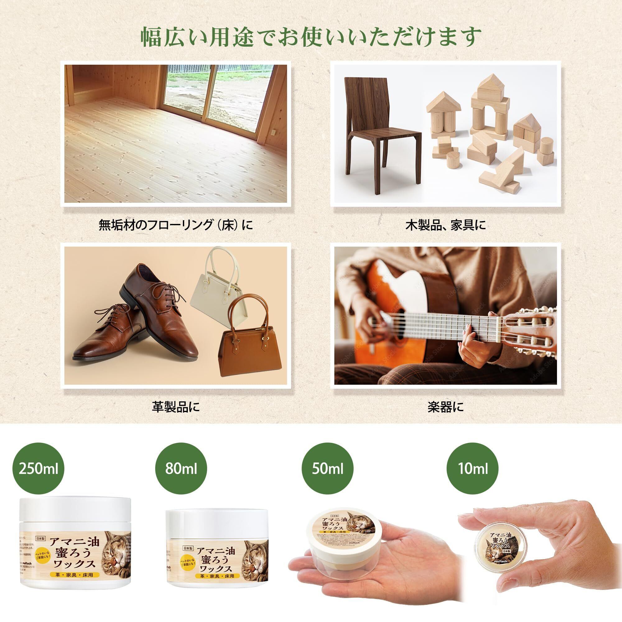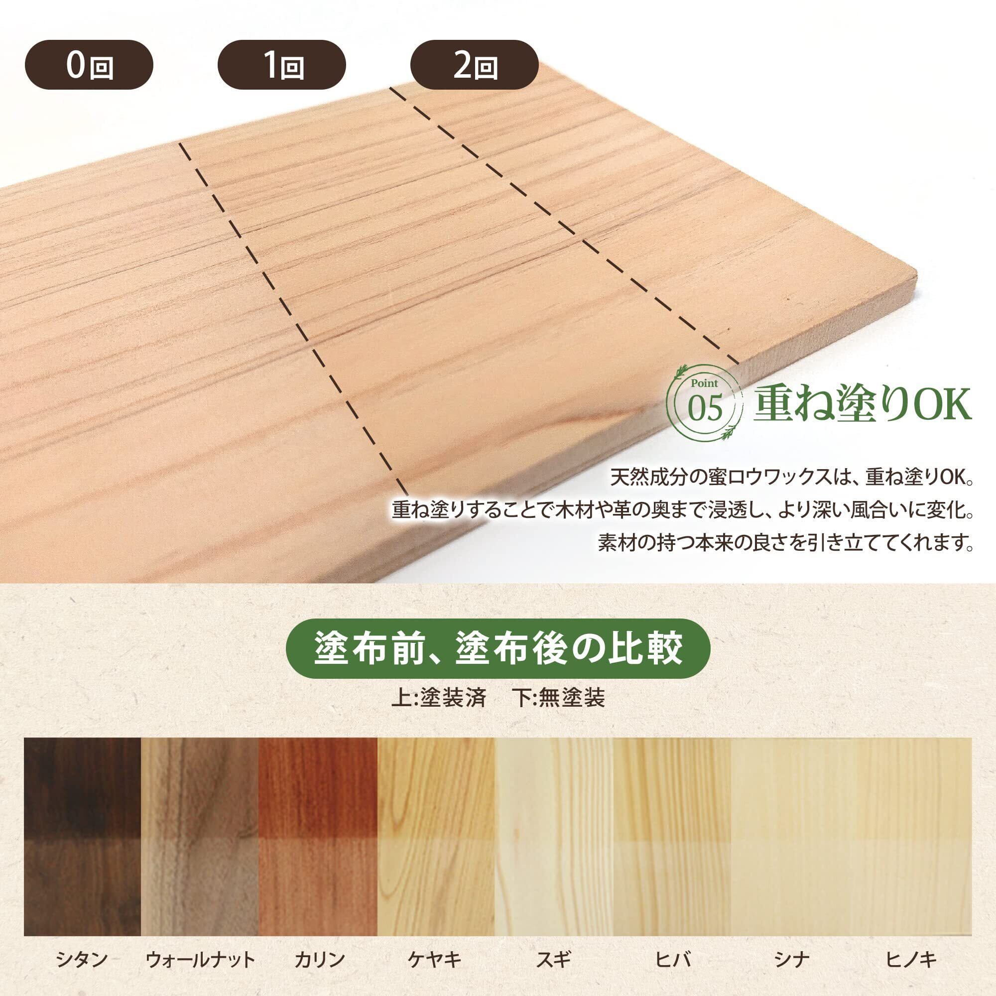 【深みのある風合いに】一般的な塗装と異なり、素材の表面ではなく内部で固まるのが蜜蝋ワックスの特徴です。表面に膜を張らないため、ギラギラとしない風合いで、素材の良さを引き出すことができます。木材と革の保護・撥水・艶出しなど様々な用途にお使いいただけ、素材の持つ深みや高級感を楽しめます。床やテーブルなどの木製家具、お財布や革ジャンバーなどの皮革製品など幅広くお使いいただけます。一度ウレタン塗装された木材には、蜜蝋ワックスが染み込みませんのでお使いいただけません。やすりなどで塗装を落としてから塗布してください。