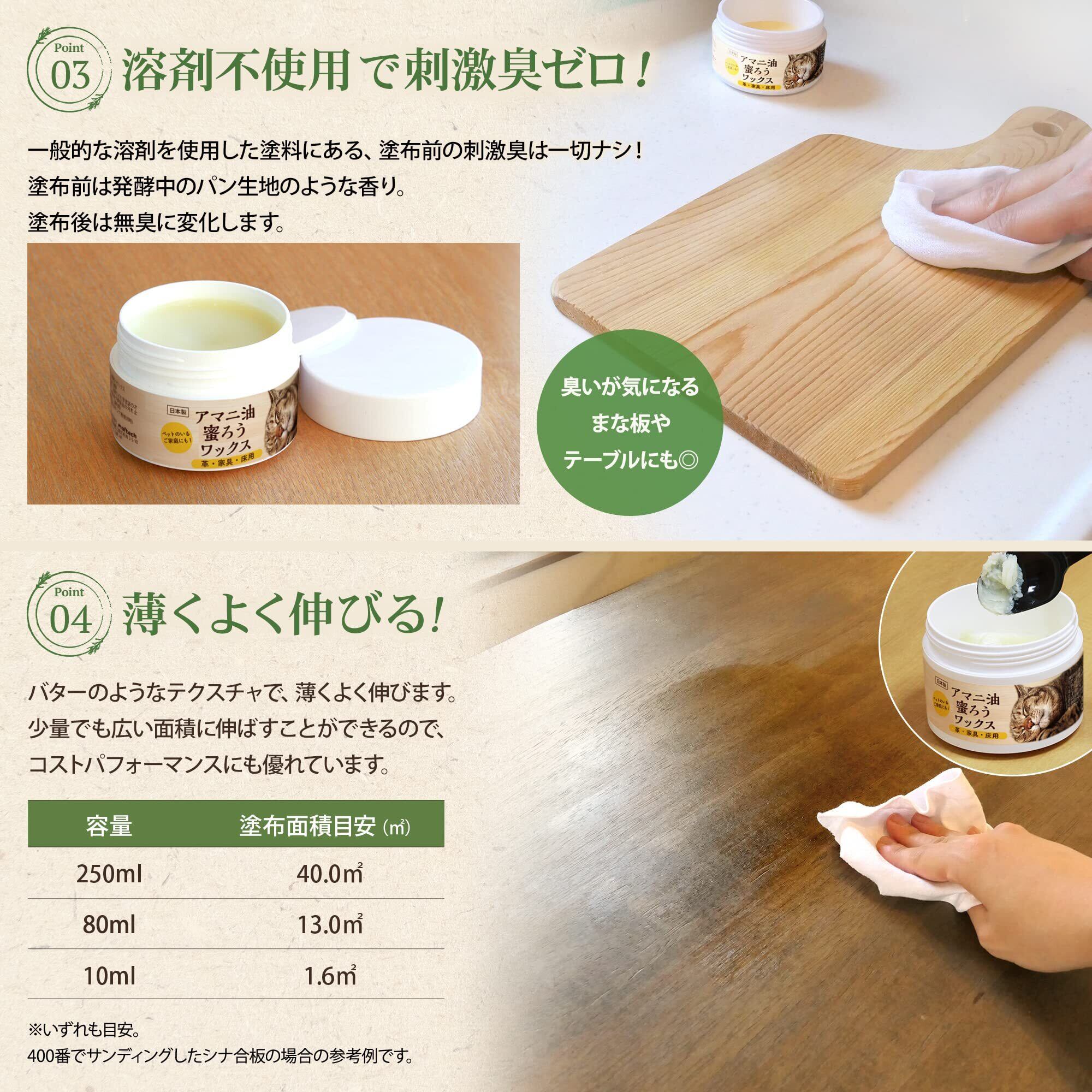 【蜜蝋多めでちょっと贅沢に】蜜蝋をやや多めに入れています。蜜蝋を多めに入れることで、塗布したときのアマニ油の臭いが抑えられ、またワックス自体の耐久性も上がります。一度塗りで十分保護されますが、もう一歩こだわる方は、二度塗りして、から拭きすると深い光沢が出ます。