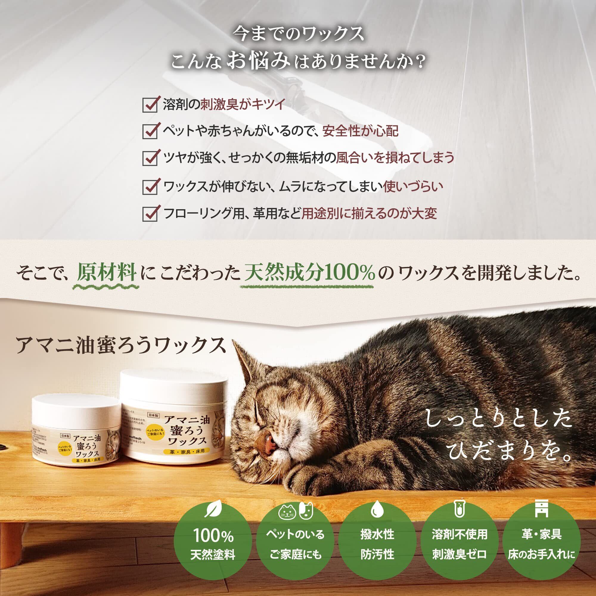 【本当に蜜蝋とアマニ油だけ!】蜜蝋と亜麻仁油のみを原料とする天然素材100パーセントの蜜蝋ワックスです。他の油や化学溶剤、酸化促進用金属、保存料などは一切使用しておりませんので、小さなお子様やペットのいるご家庭でもお使いいただけます。国内工場で丁寧に作りました。