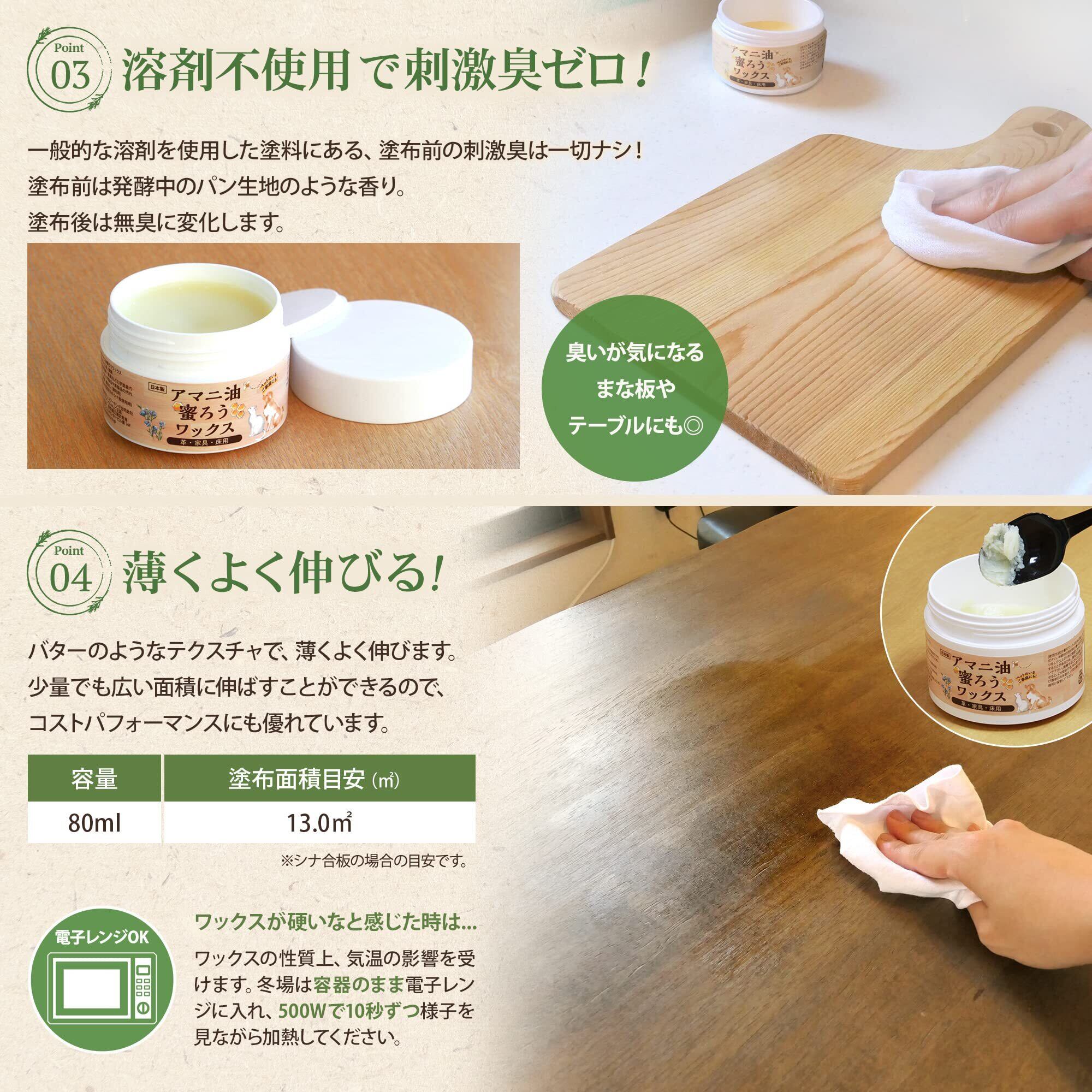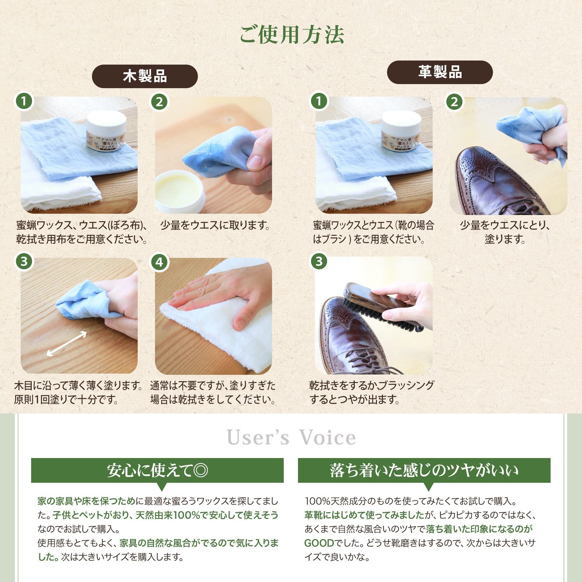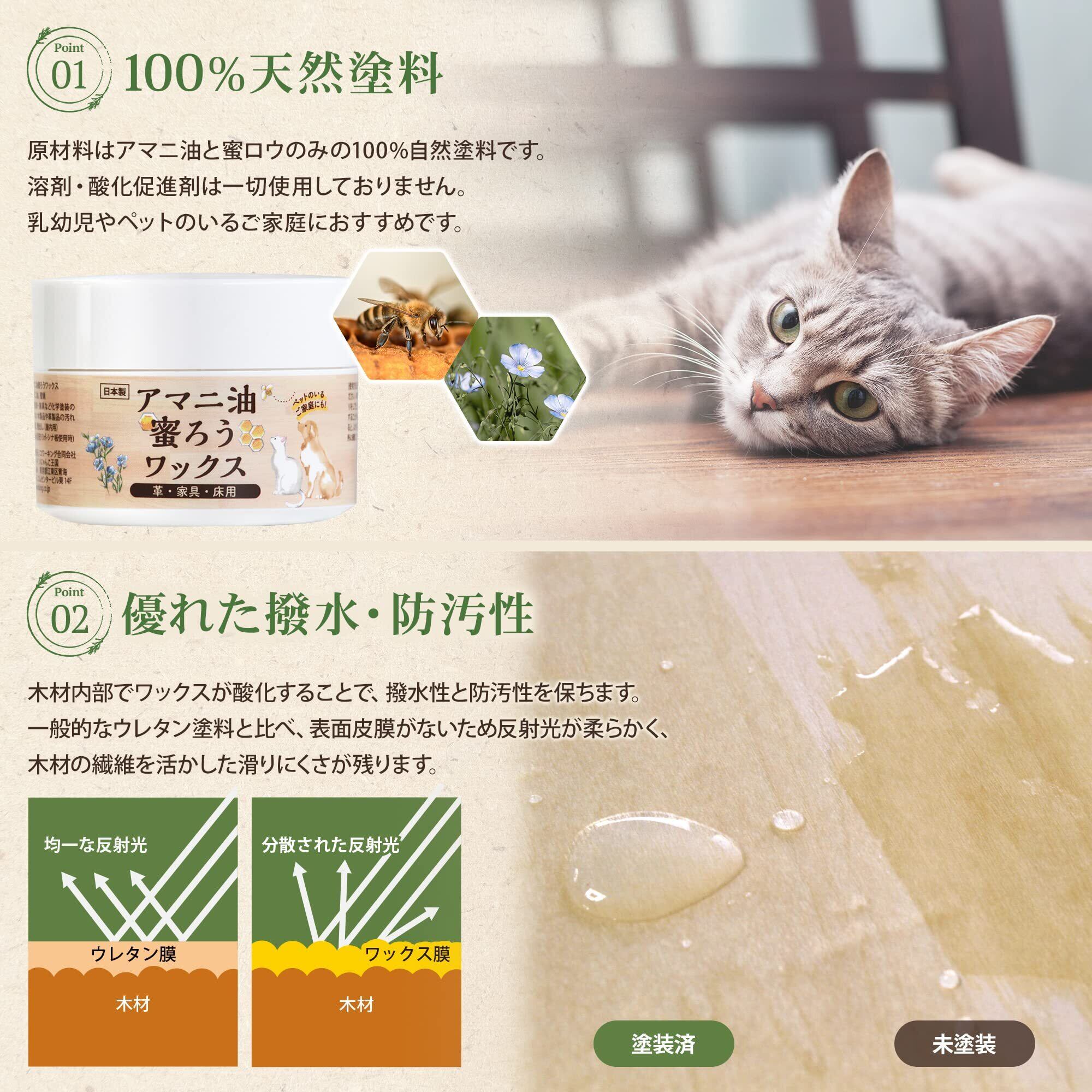 【本当に蜜蝋とアマニ油だけ!】蜜蝋と亜麻仁油のみを原料とする天然素材100パーセントの蜜蝋ワックスです。他の油や化学溶剤、酸化促進用金属、保存料などは一切使用しておりませんので、小さなお子様やペットのいるご家庭でもお使いいただけます。国内工場で丁寧に作りました。