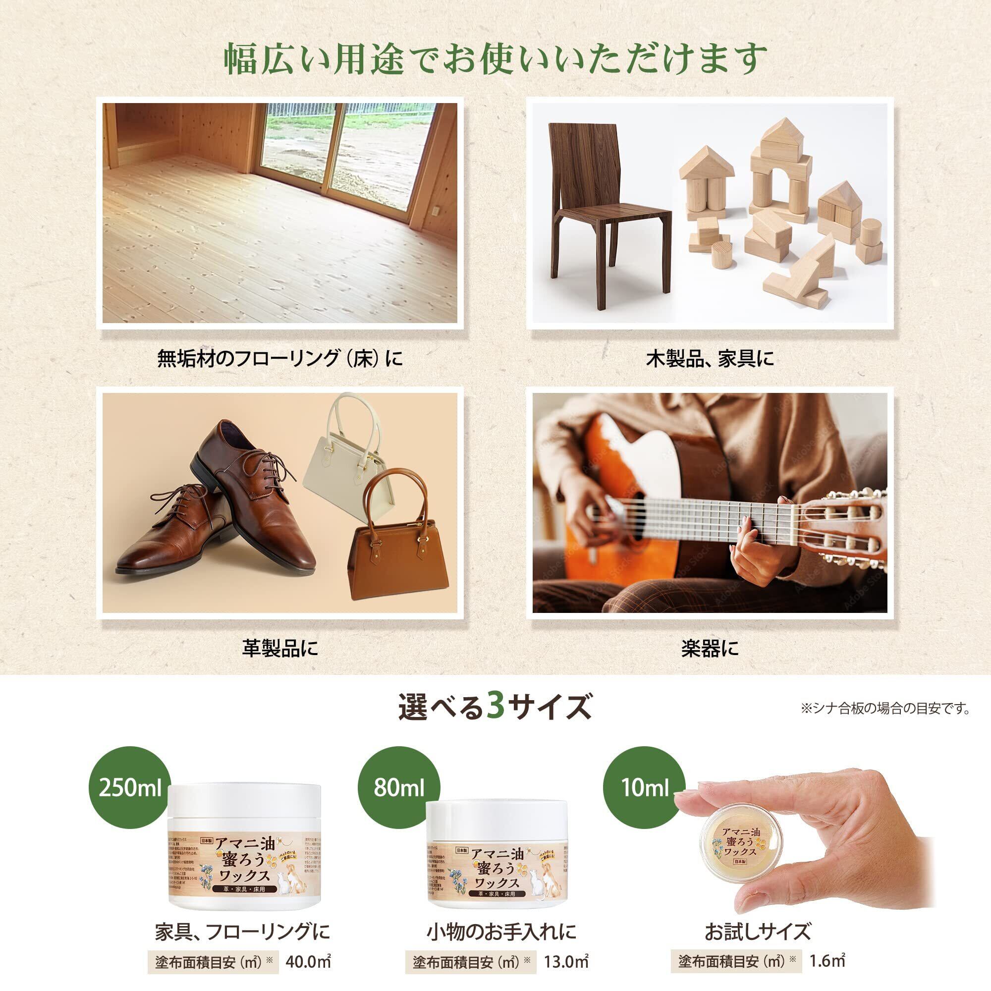 【深みのある風合いに】一般的な塗装と異なり、素材の表面ではなく内部で固まるのが蜜蝋ワックスの特徴です。表面に膜を張らないため、ギラギラとしない風合いで、素材の良さを引き出すことができます。木材と革の保護・撥水・艶出しなど様々な用途にお使いいただけ、素材の持つ深みや高級感を楽しめます。床やテーブルなどの木製家具、お財布や革ジャンバーなどの皮革製品など幅広くお使いいただけます。一度ウレタン塗装された木材には、蜜蝋ワックスが染み込みませんのでお使いいただけません。やすりなどで塗装を落としてから塗布してください。