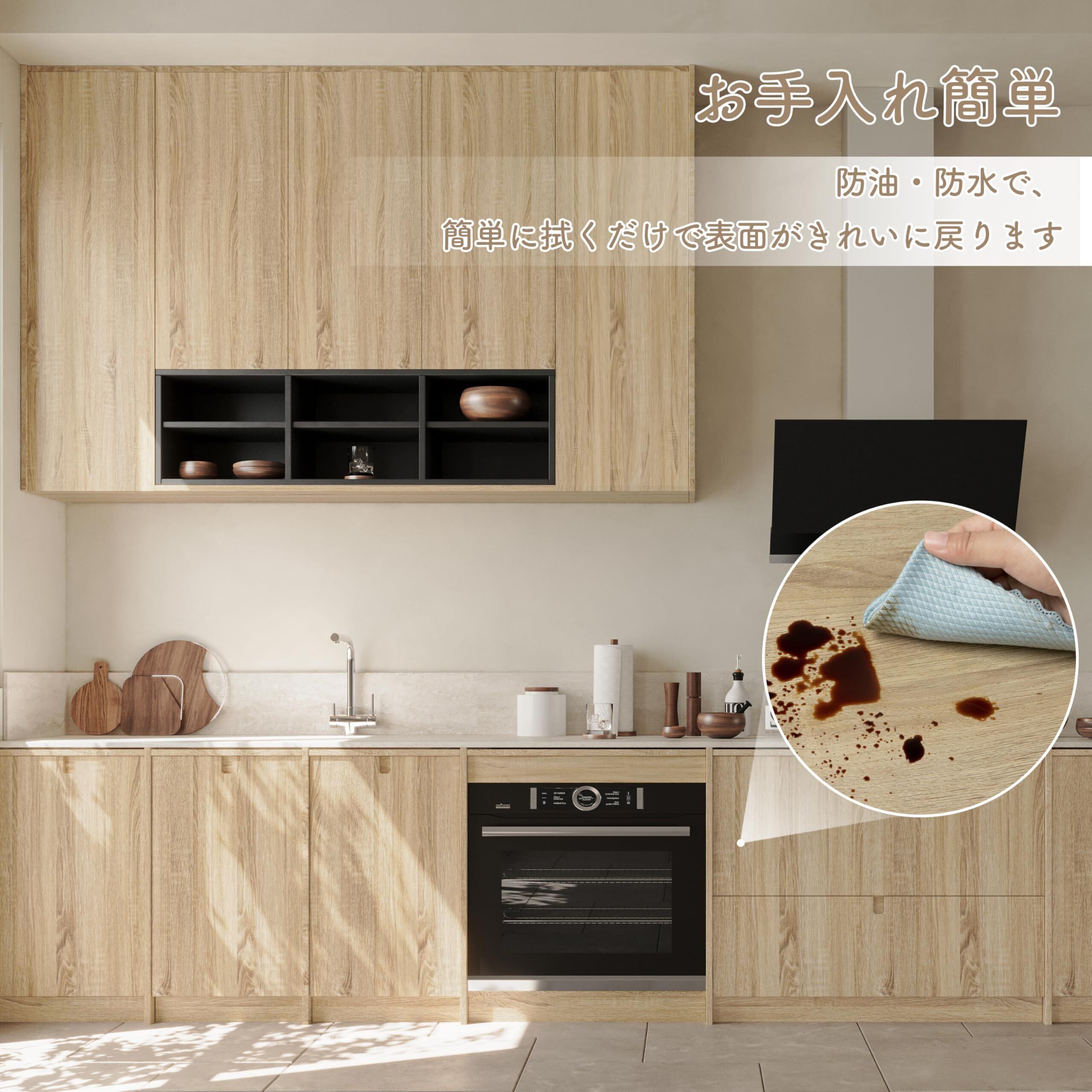 お手入れの簡単さ:PVC(ポリ塩化ビニル)製の壁紙シールは、耐熱性・耐油性・耐水性に優れています。キッチンの油汚れやお手洗いの水滴は、湿らせた布で軽く拭くだけで簡単に落とせます。注意:防水仕様ですが、浴室などの長時間の水没や直接水をかけるようなご使用はお控えください。耐油性・耐熱性は備えておりますが、耐火性能はありません。ストーブやコンロなどの火気からは十分な距離を保ってご使用ください