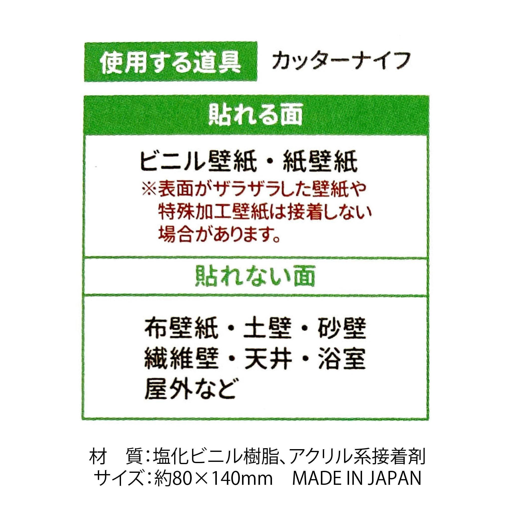 貼れる素材:ビニル壁紙、紙壁紙(表面がザラザラした壁紙や特殊格壁紙は接着しない場合があります。