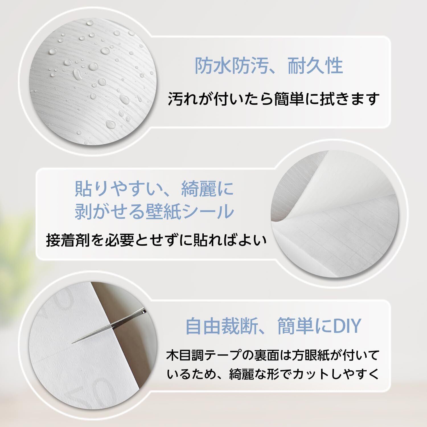 【貼りやすい剥がせる壁紙シール】木目調テープの裏面に粘着剤が付いており、そのまま貼り付けられる。貼ってはがせる木目シートですが、しわや破れなどになりにくいタイプで、キレイに貼れます。15cmの幅で、初心者一人でも簡単で仕上がります、賃貸でも安心にご利用いただけます。