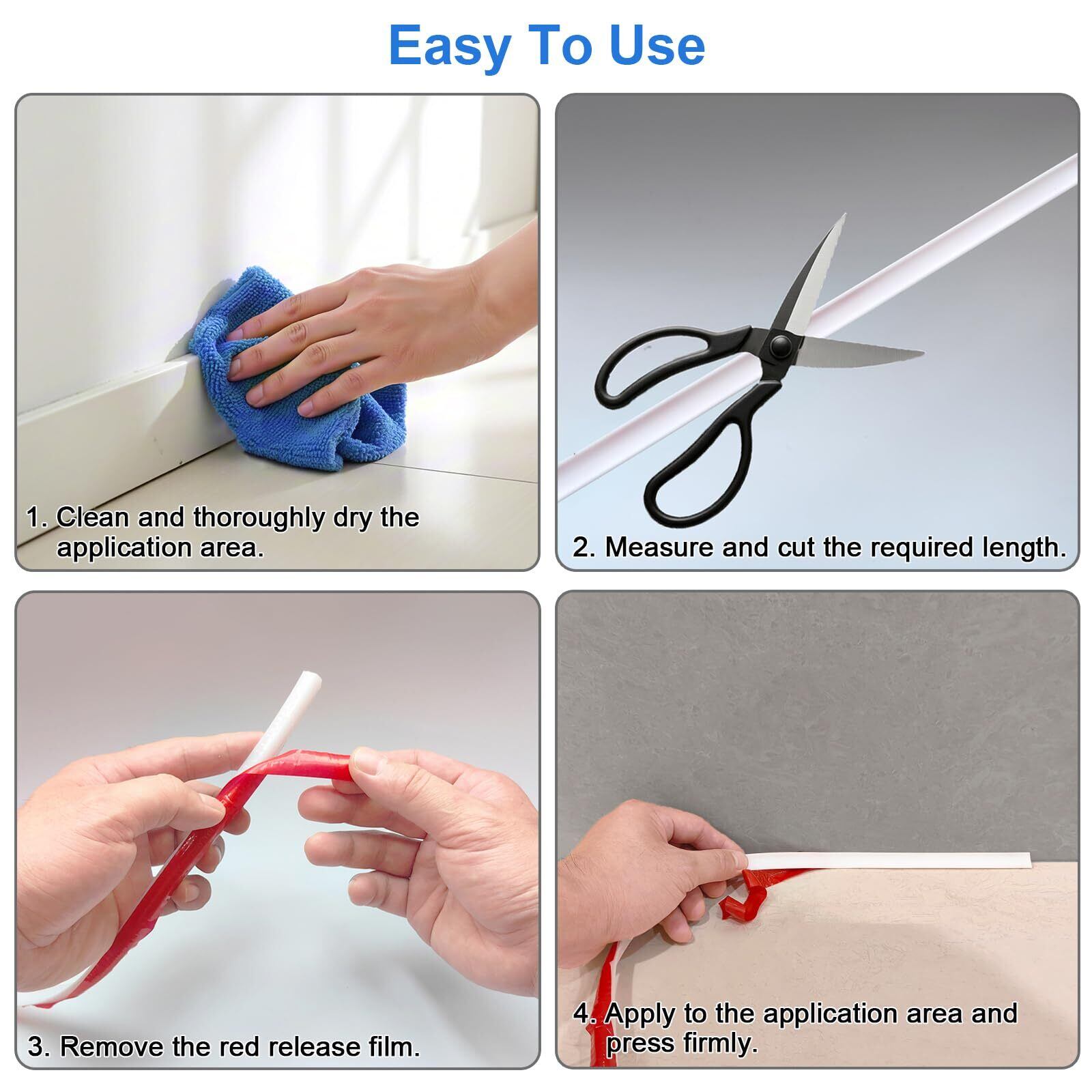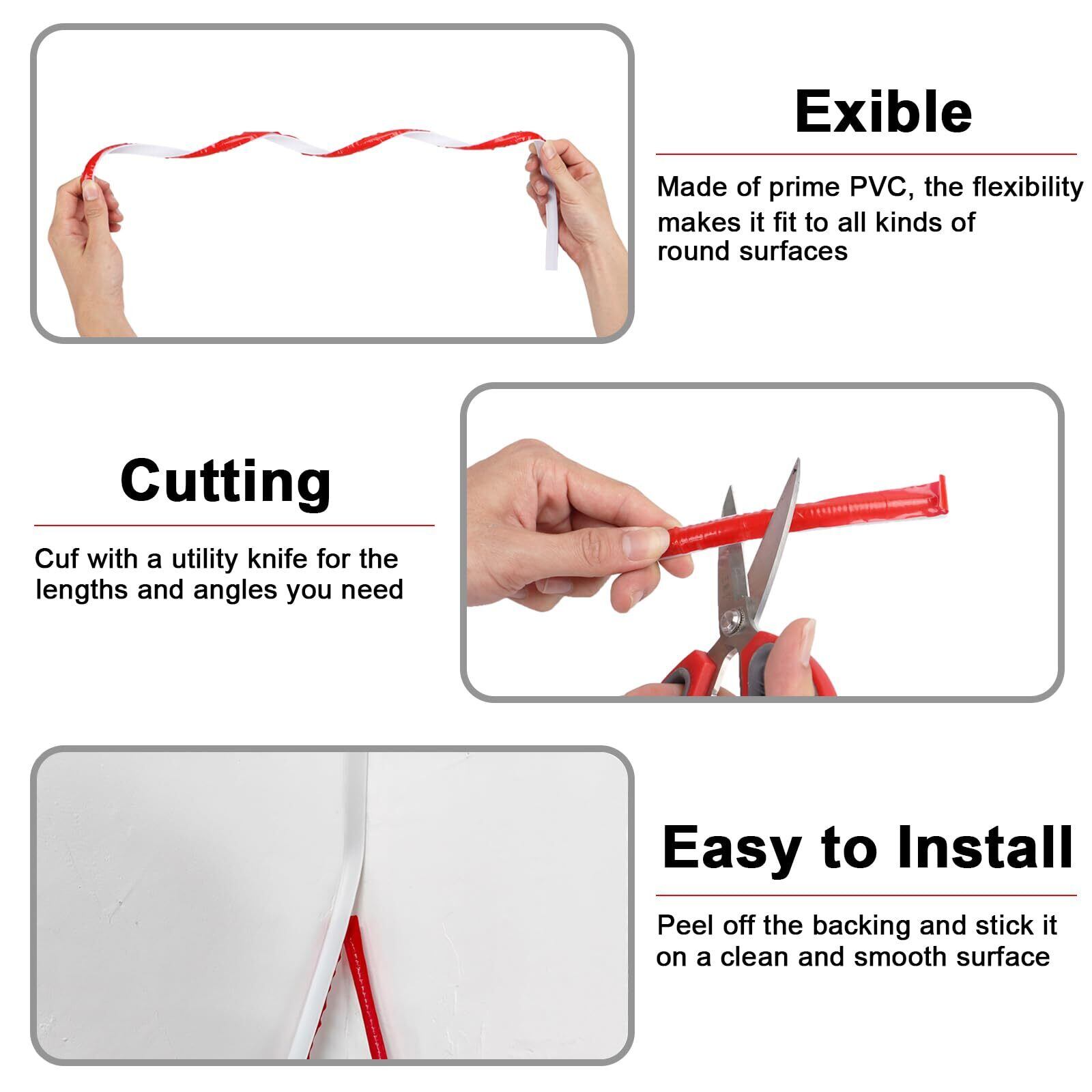 【取り付けが簡単】:壁エッジストリップ 自己接着の取り付けは非常に簡単です。最初に測定して必要な長さにカットし、壁をきれいにしてから、壁エッジストリップの背面にある赤いフィルムを剥がし、押します。滑らかで乾燥した表面に締め付けて取り付けを完了します。 (注意:剥がれたりほこりの多い壁、湿気、汚れ、凹凸のある壁、壁装飾壁紙などには貼らないでください。)
