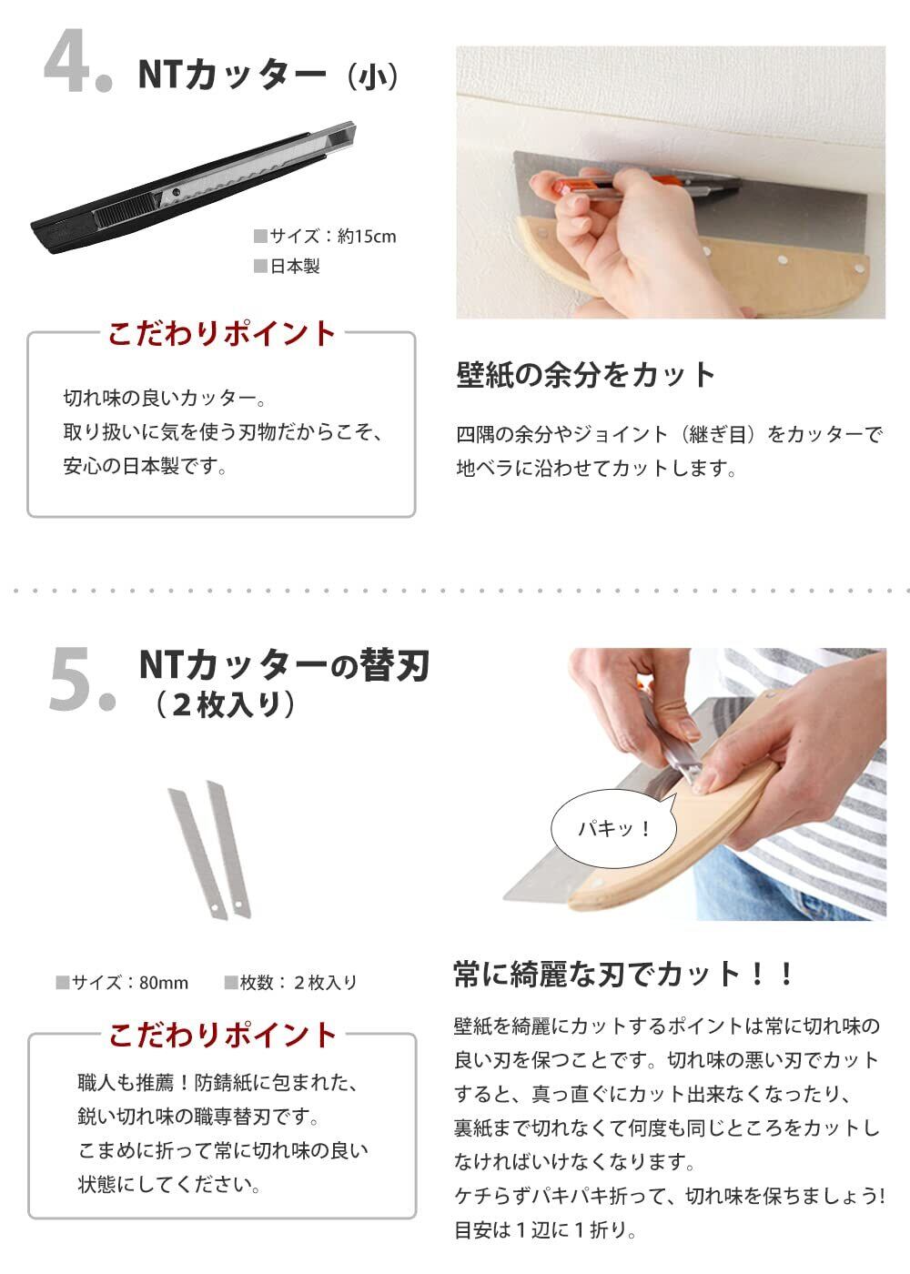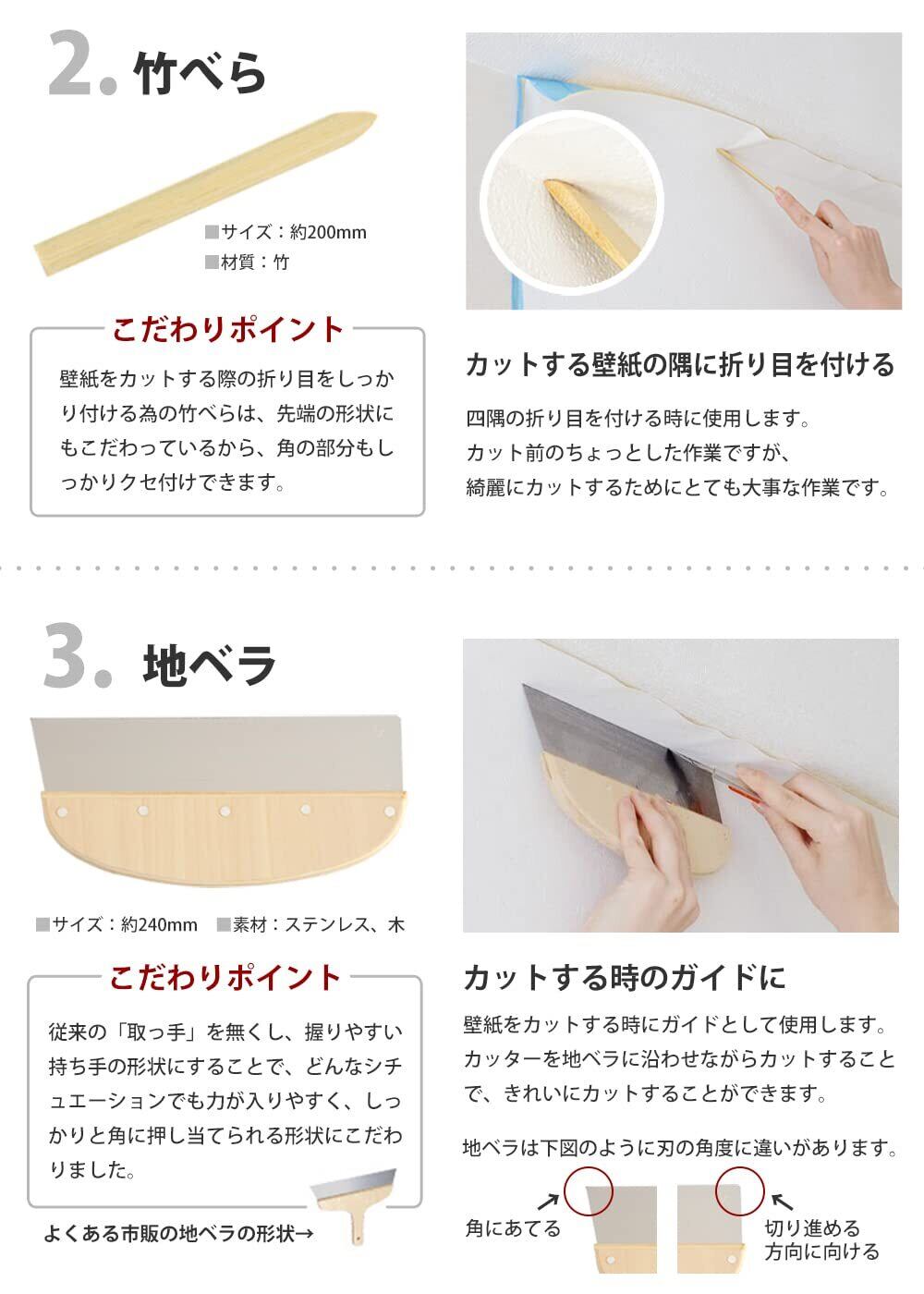 【使用用途】なでバケ:壁紙の空気を抜く、竹べら:カット時のくせつけ用、地ベラ:壁紙のつなぎ目や余分な壁紙をカットする際のカッターガイド、カッターとカッター替刃:壁紙のカットに、ジョイントローラー:壁紙のつなぎ目の圧着に使う、スポンジ:余分な糊の拭き取りや仕上げ時の拭き取りに