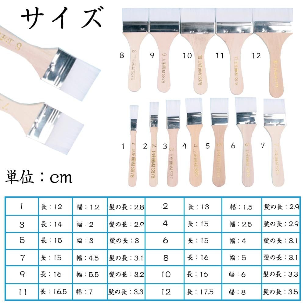 [サイズ]:1号:12*1.2cm、2号:13*1.55cm、3号:14*2cm、4号:15*2.5cm、5号:15*3cm、6号:15*4cm、7号:15*4.5cm、8号:16*5cm、9号:16*5.5cm、10号:16*6cm、11号:16.5*7cm。 12号:17.5*8cm、異なるサイズのブラシ12本