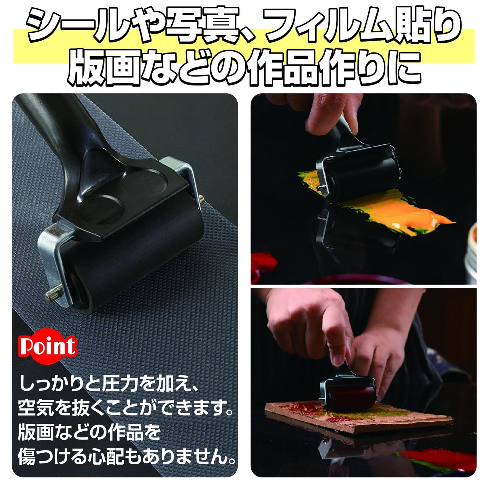 適度な重みと柔らかさ。手になじむコンパクトなサイズ感!シールや写真、フィルム貼り、版画などの作品作りにも。作品を傷つけることなく、しっかりと圧力を加え、空気を抜くことができます。