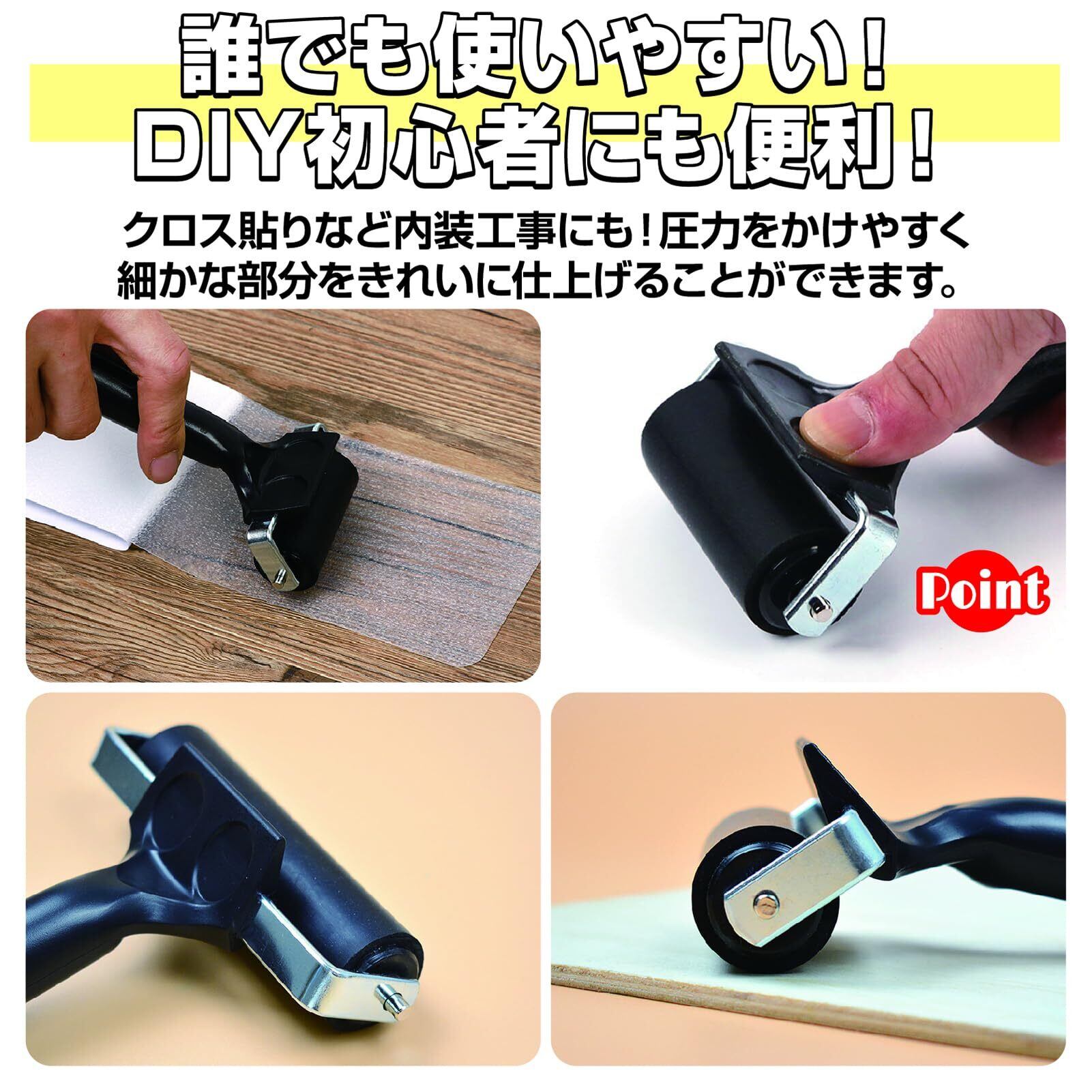 クロス貼りなど内装工事にも!小さめサイズながら、親指で圧力をかけて、細かな部分をきれいに仕上げることができます。誰でも使いやすい圧着ローラーは、DIY初心者にも便利なアイテムになりそう!
