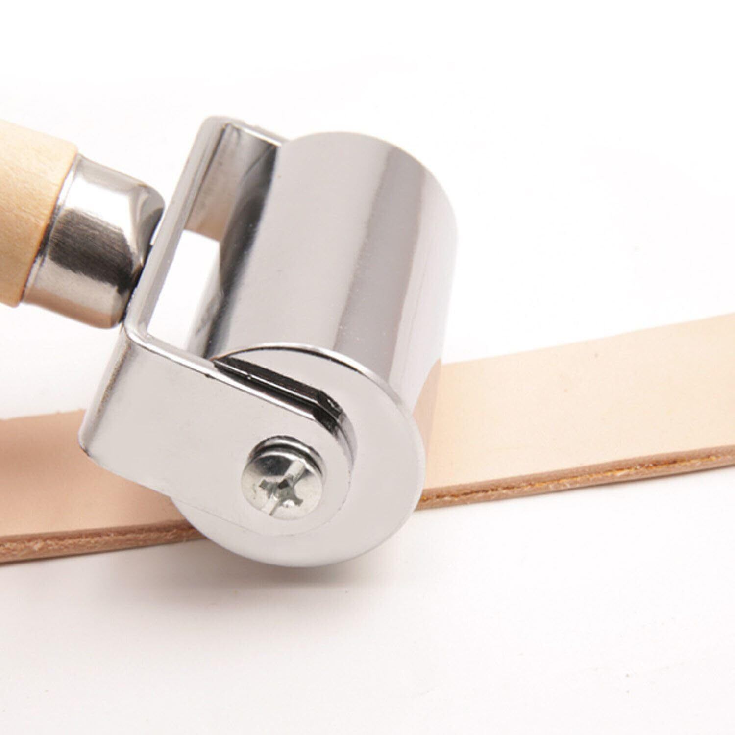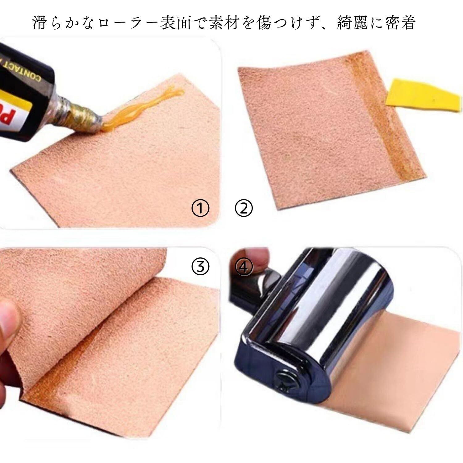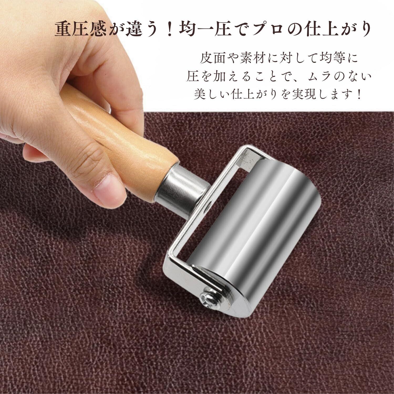 【転がすだけで簡単圧着】皮製品の接着や加工に最適な圧着ローラー。ヘリ返しや貼り合わせなどの作業が、ローラーを転がすだけでムラなく仕上がります。手軽にプロのような仕上がりを実現できます。