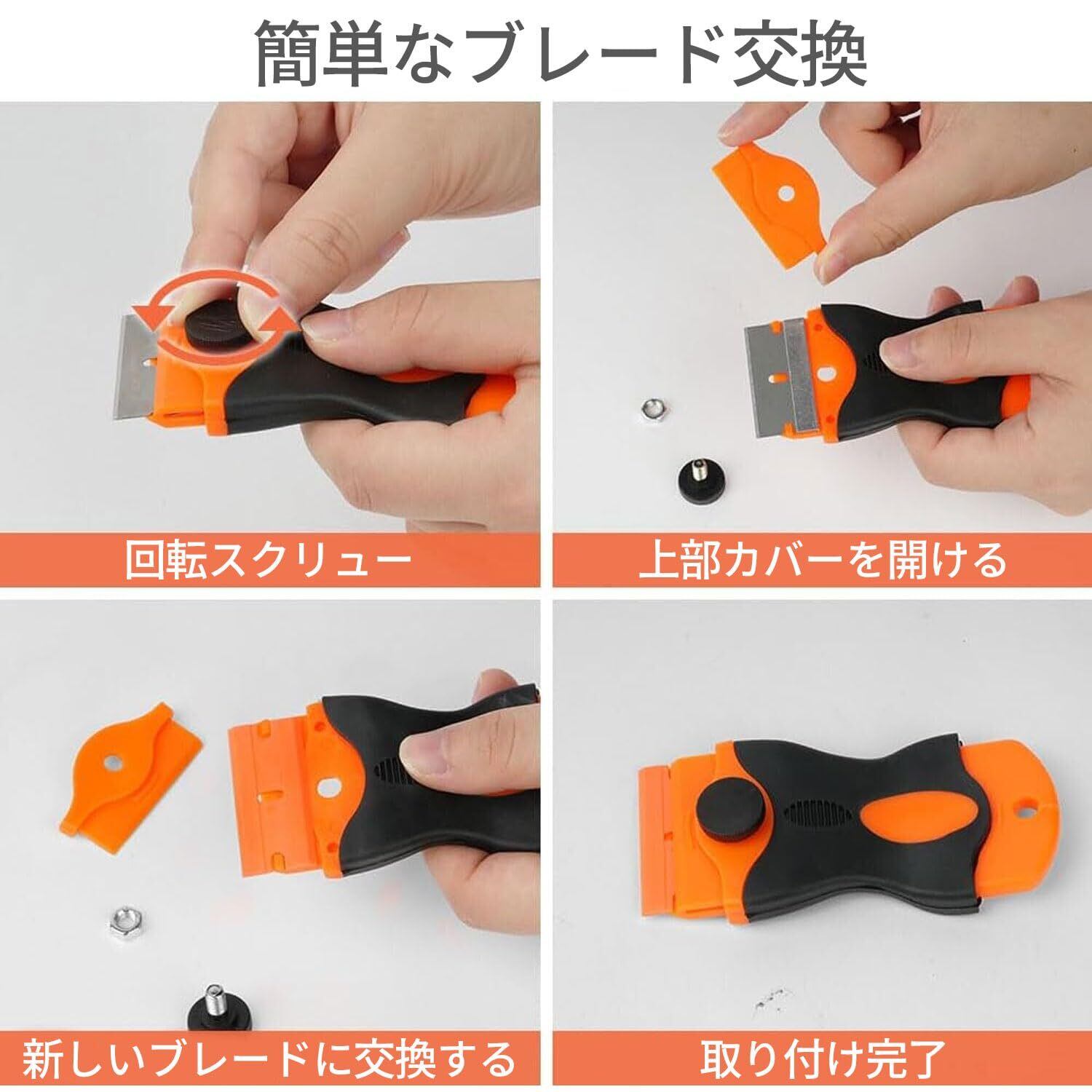 ️【ブレード方法】使用場所に応じてブレードを替えることが出来ます。替え刃の時はとても簡単で他の工具を用いることはございません。1、スクレーパーに付いている固定ねじを外します。2、ブレードカバーを外します。3、ブレードを取り外します。4、ブレードをしてブレードカバーを戻し、ねじで締めたら完了。
