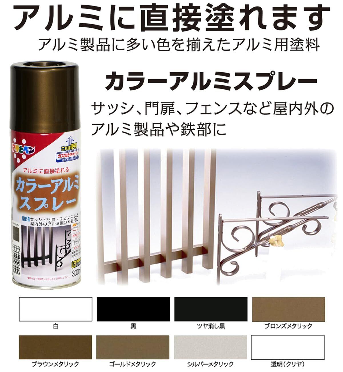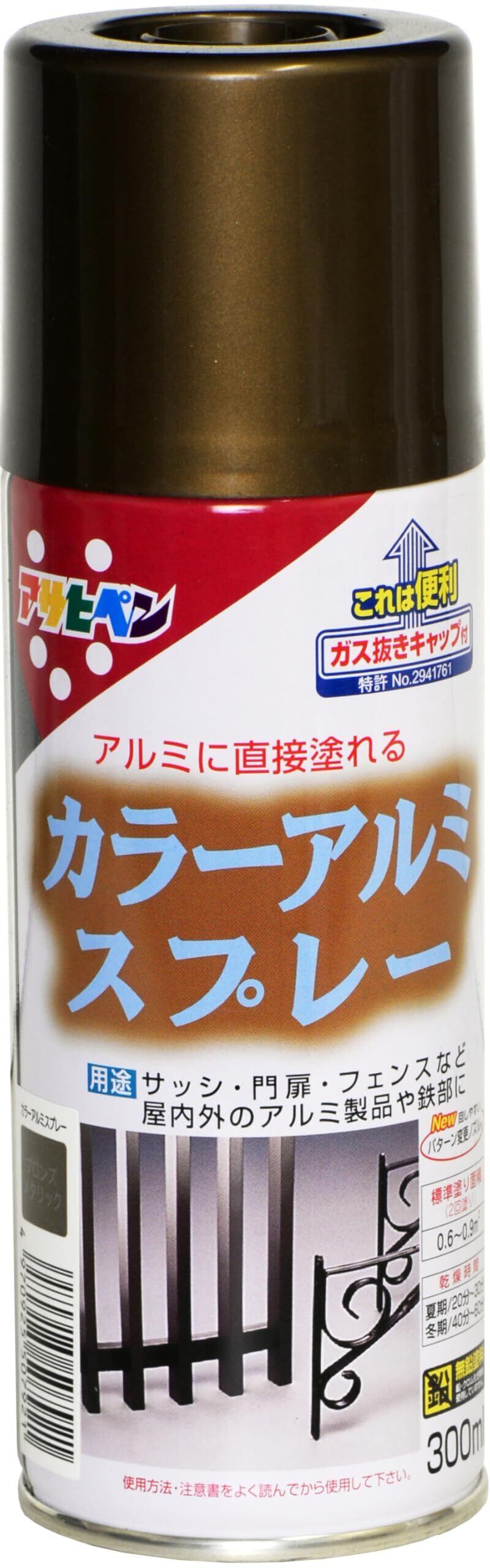 アサヒペン カラーアルミスプレー 300ML ブロンズメタリック ツヤあり だ円吹き パターン変更ノズル 安全ガス抜きキャップ付き アルミに直接塗れる 日本製
