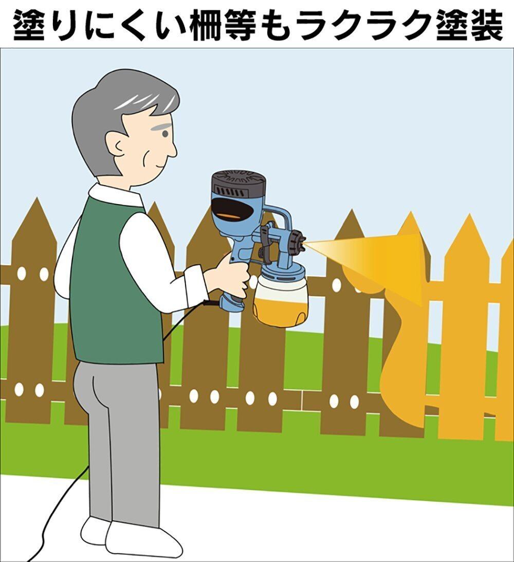 【様々な場所の塗装に大活躍】広い面積もあっという間に塗装。刷毛やローラーで塗るより圧倒的にムラなく美しく、手軽に素早く塗装ができます。凹凸のある場所もムラなく塗装。柵のような塗りにくい場所でも楽々塗装できます。素人でもプロ並の仕上がりが期待できる、電動スプレー吹付け式の塗装機です。霧状の超微粒子の塗料が、木材・プラスチック・金属にしっかりと付着します。