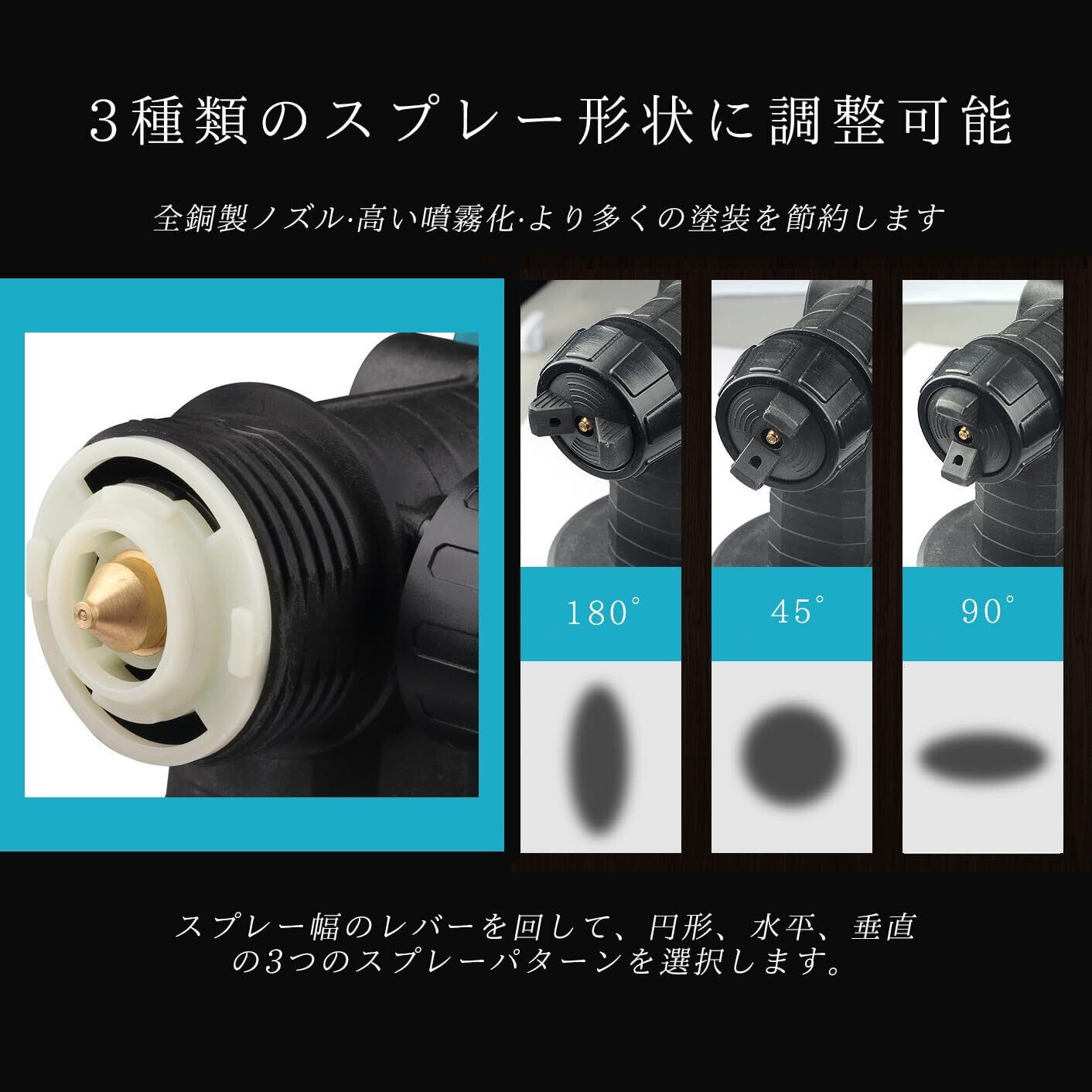 【噴霧形状/幅調節でき&優れ放熱機能】スプレー幅レバーを回転する「角度調整45°・ 90°・180°」と、噴射パターンを円形・水平・垂直の3つパターンを選択できます。また、機械側のボダンが左右回転でパターンの幅を調節可能、作業シーンに応じて変更して、さまざまな塗装プロジェクトに適しています。