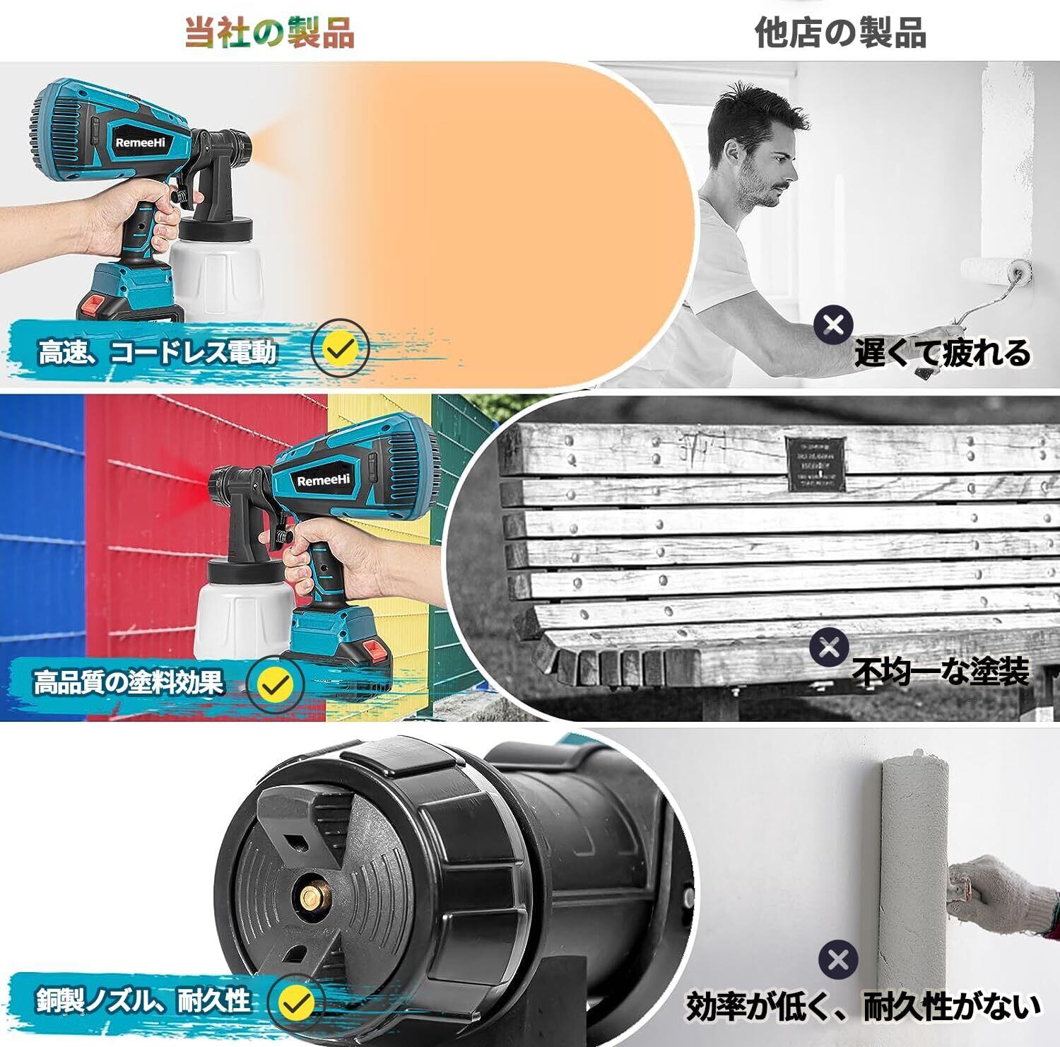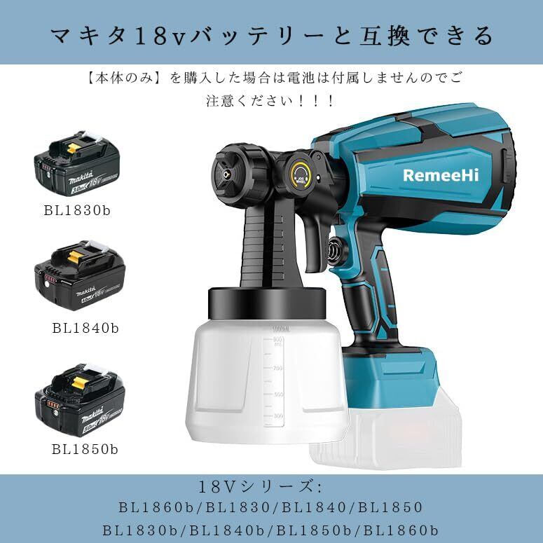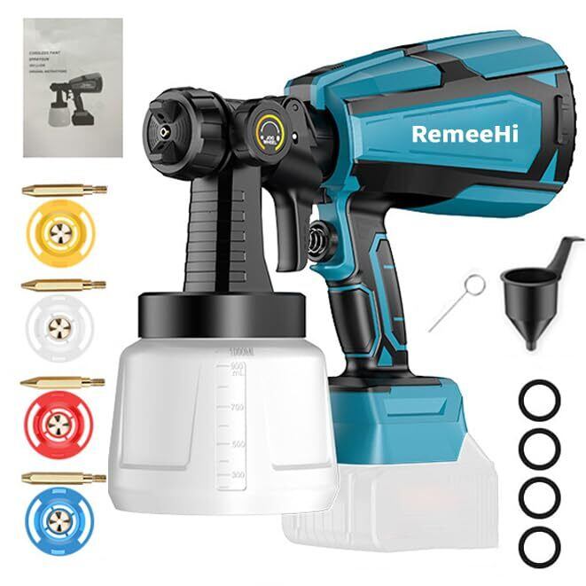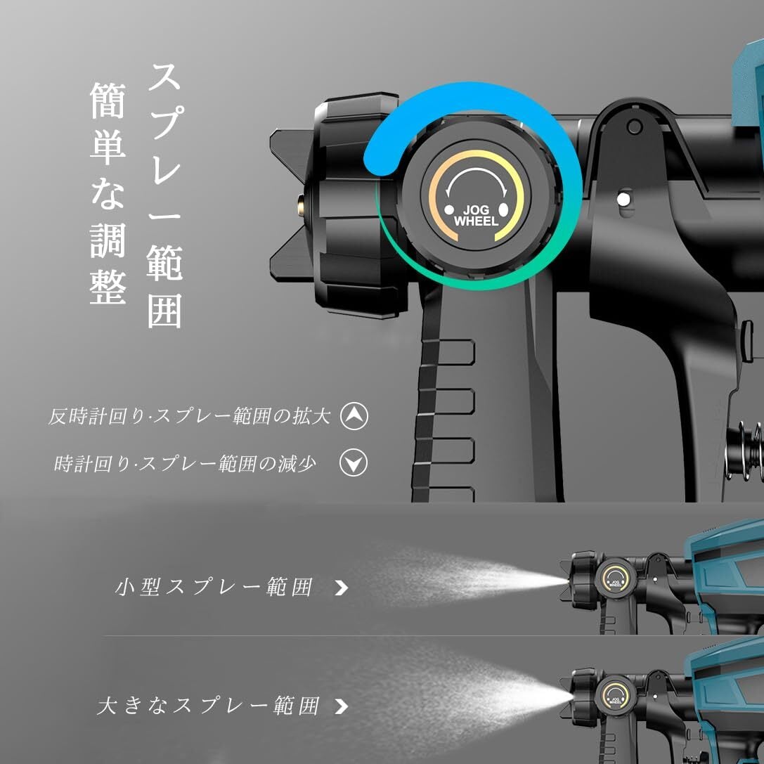 【コードレス式&マキタ18V、21Vバッテリー対応】コードレスタイプのスプレーガンなので、とっても便利です、電源コードの邪魔が無し、アウトレットがない場所も楽に作業可能です!低い圧力・大量の空気で塗料を包むように吹くため飛散の少ない高性能塗装機です。·HVLP噴霧器の強大なモーターとタービンファンは100 DINまでの最大粘度を支持することができ。塗料には、水性塗料も油性塗料も使うことが可能です。先端キャップの色が写真と異なる場合があります。あらかじめご了承ください。付属のバッテリーはマキタのバッテリーではありませんのでご注意ください。 ただし、本製品はマキタの18Vバッテリーと互換性があります。