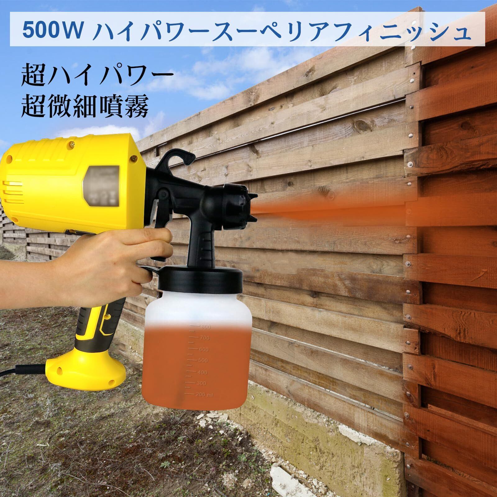 調整可能なスプレー形状:3種類のスプレーパターン(水平(90°),垂直(180°)、円形(45°)ジェット)を装備して,作業シーンに合わせてし,最適なスプレー形状を選択できます。 率よく塗装でき,DIYにとても便利です。 500Wの強力なパワー,強力なスプレー能力。スプレーガンを使用するときボトルの中の塗料の残量に注意してください。残量が100-150 mlになる前すぐに補充してください。そうしないと,スプレーの効果が不安定になります。ペンキポットのチューブ吸引口がペンキに完全に浸かっていないか注意してください。チューブが液体を吸い続けられないため,スプレーガンの噴射が不安定になることがあります。