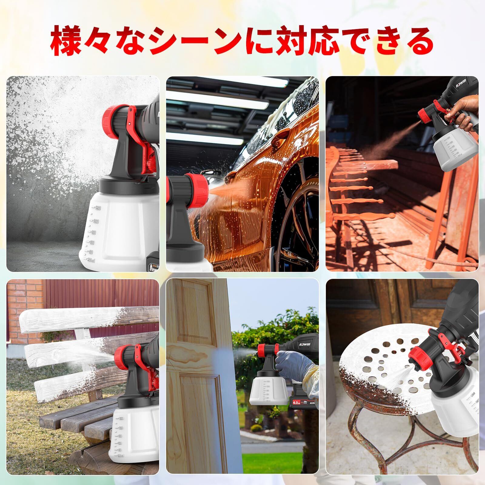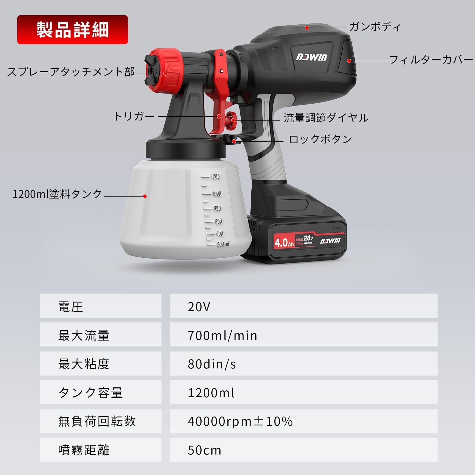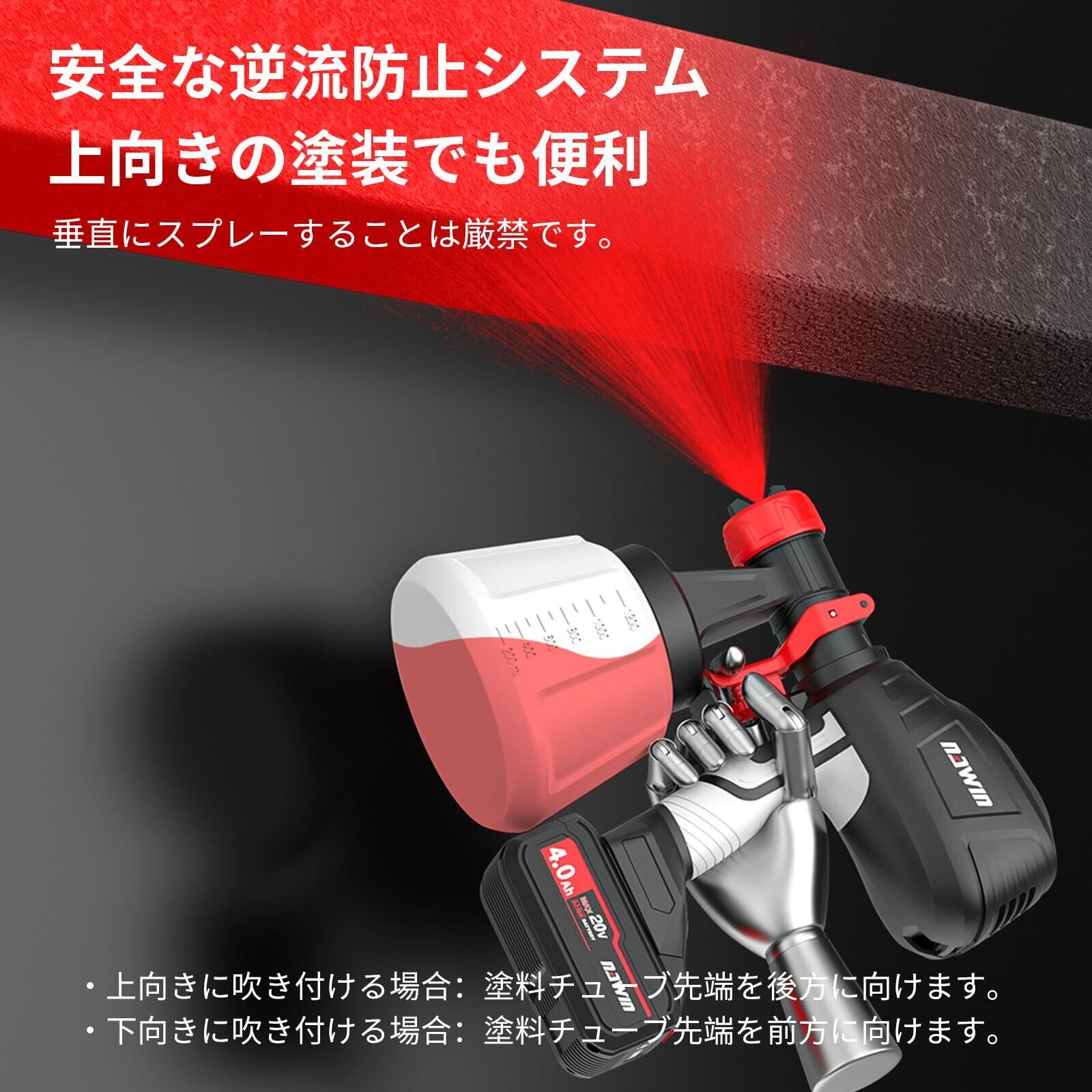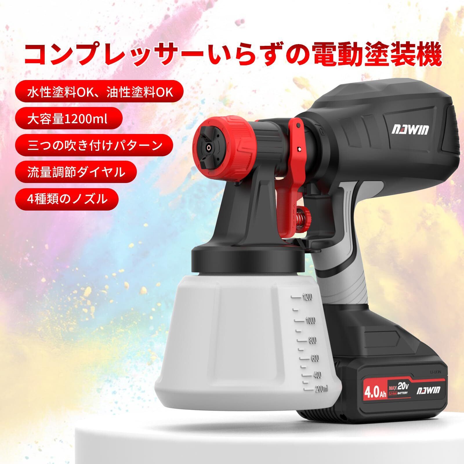 ナウィン コードレススプレーガン 20V電動スプレーガン 充電式塗装ガン 1200ml大容量塗装機 水性油性塗料対応 噴射量調節可能 三つの吹き付けパターン 4種類のノズル 4.0Ahバッテリー2個付き