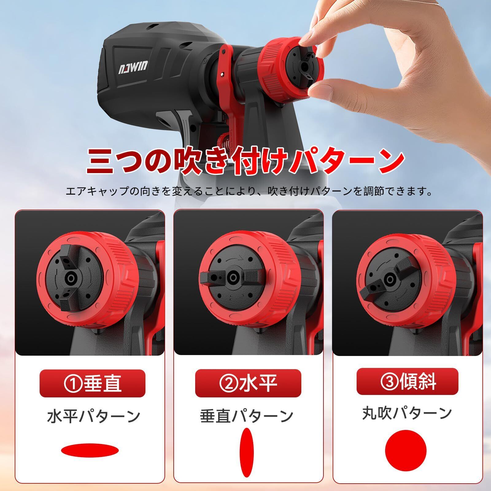【3種類の吹き付けパターン】当社の充電式塗装ガンは、エアキャップの向きを簡単に調整することで、吹き付けパターンを自由に切り替えることができます。水平パターン、垂直パターン、円形パターンの3種類の噴霧形状を実現し、さまざまな作業シーンや塗装プロジェクトに対応可能です。これにより、広い面積や細かい部分など、多様な塗装ニーズに柔軟に対応でき、コードレススプレーガンは効率的で高品質な仕上がりを実現します。