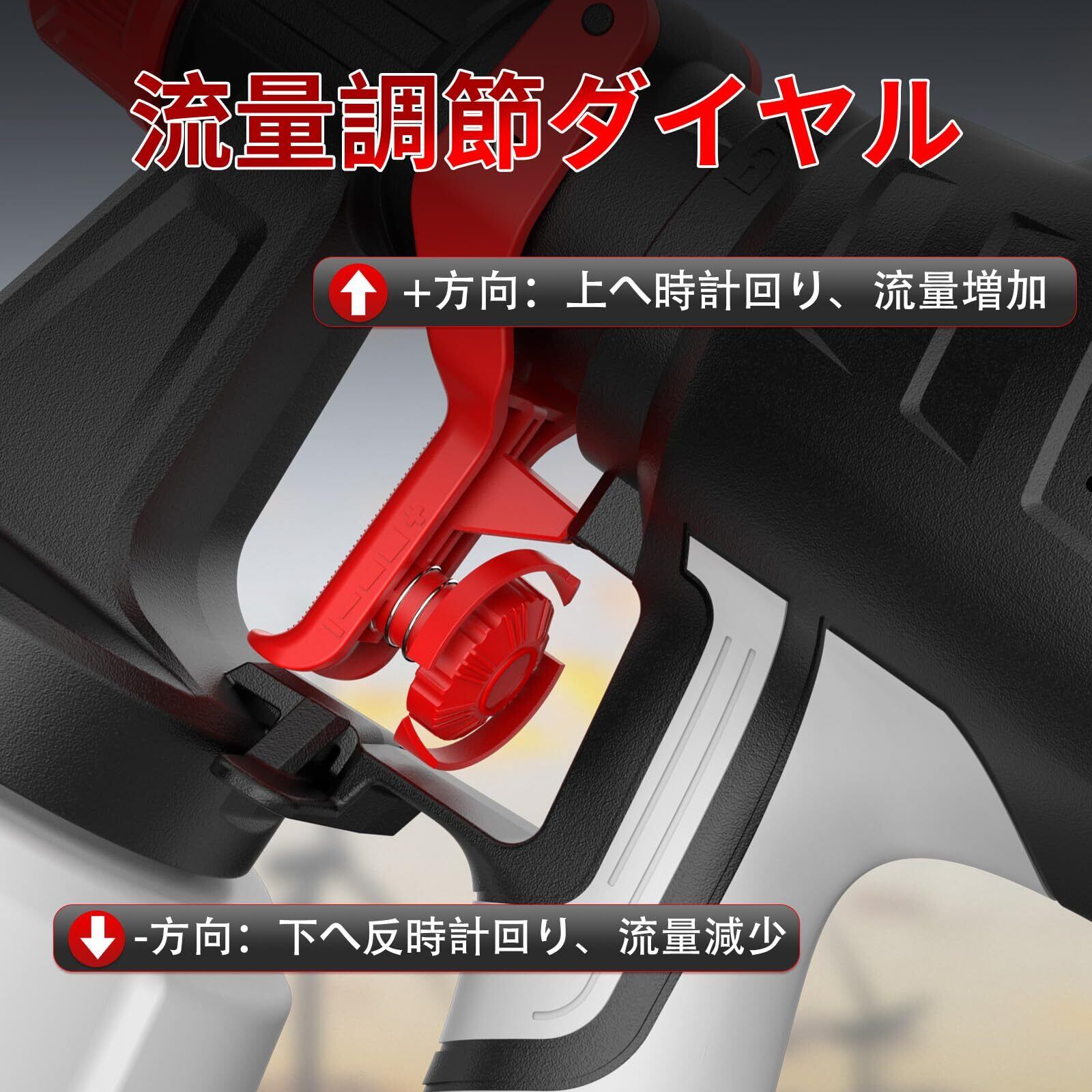 【流量調節ダイヤル】当社の電動スプレーガンは、調節ダイヤルを採用しており、簡単に流量を調整できます。ダイヤルを時計回りに回すと流量が増加し、反時計回りに回すと流量が減少します。これにより、作業シーンや塗装のニーズに応じて最適な流量を設定でき、効率的で精密な塗装作業を実現します。