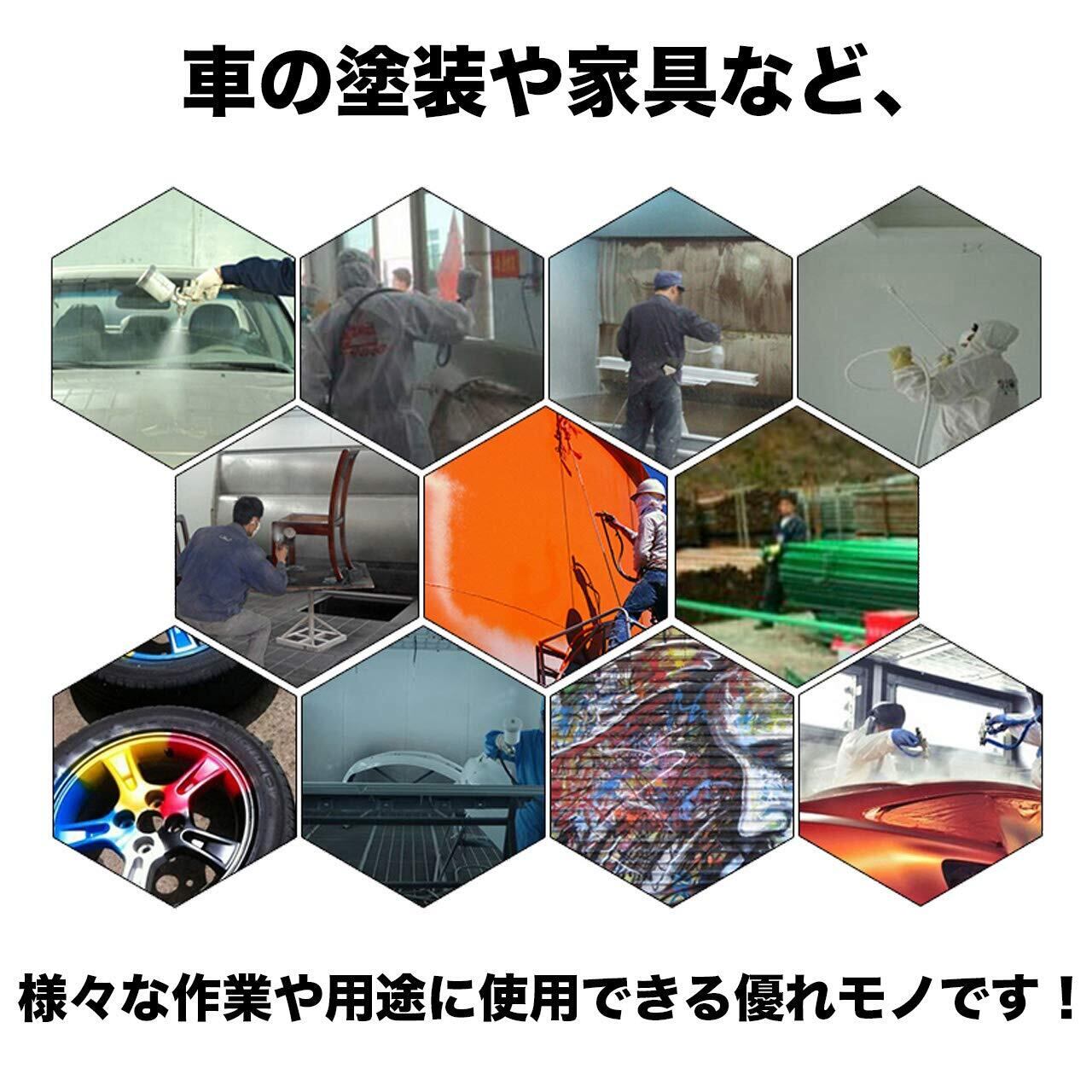 吹付圧:0.3~0.68Mpa 吹付距離:15~20cm タンク容量:400ml 噴霧量:180~200L/min 重量:本体440g+タンク90g (エアーコンプレッサーは別途ご用意ください)