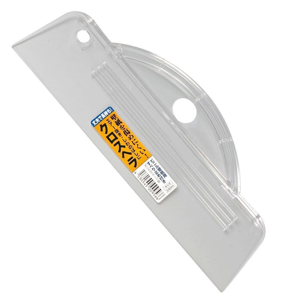 壁紙を傷めにくく、エアー抜き、しわのばしができるすべり止め付クロスヘラ。透明なので、下地が見えて作業が快適、丈夫で長持ちするビニル壁紙用ヘラ。