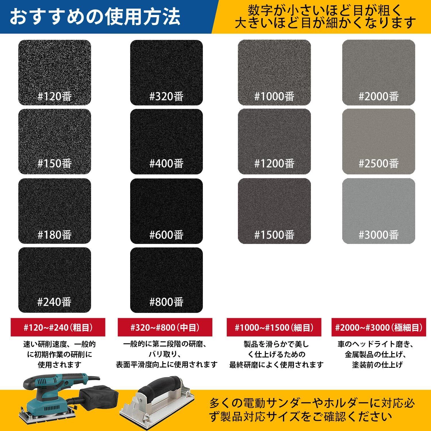 【耐水ペーパー セット・粗目~極細目】#120、#240、#400、#600、#800、#1000、#1200、#1500、#2000、#3000 各4枚合計40枚、紙やすり背面に数字が印刷されており、数字が小さいほど粗目、大きいほど細目です